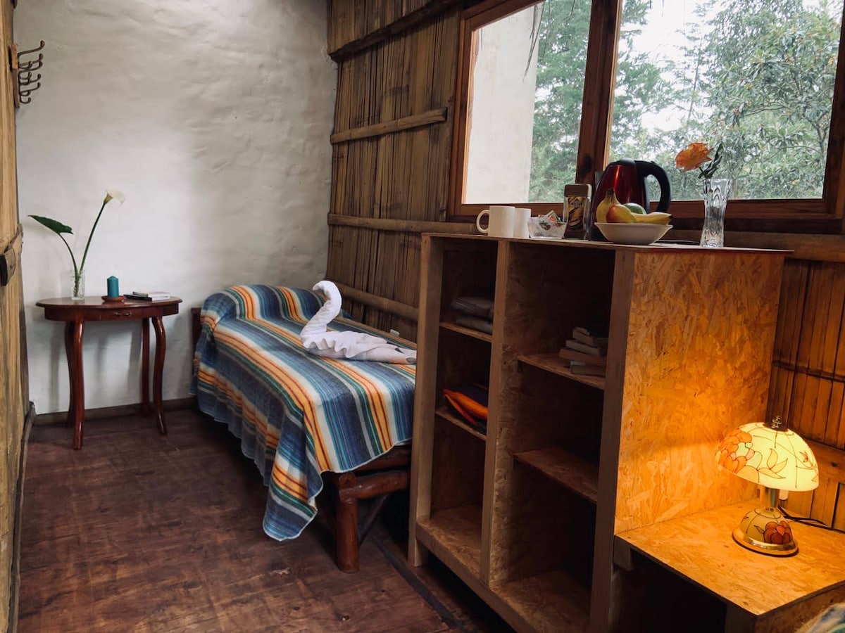 Cabañas de madera a 2 metros del suelo sobre postes, un ambiente, con cocina bien equipada y 2 camas dobles. Baño privado con ducha caliente. Bien iluminada. Dentro de una reserva natural; sonido de aves y de río que está en frente. Tranquilidad. Se accede al centro del pueblo en 20 minutos caminando. Se ofrece café de nuestras plantas, mermeladas , frutas de estación, etc. Hay un sistema de senderos circundantes, del Bosque Protector Rumi Wilco.