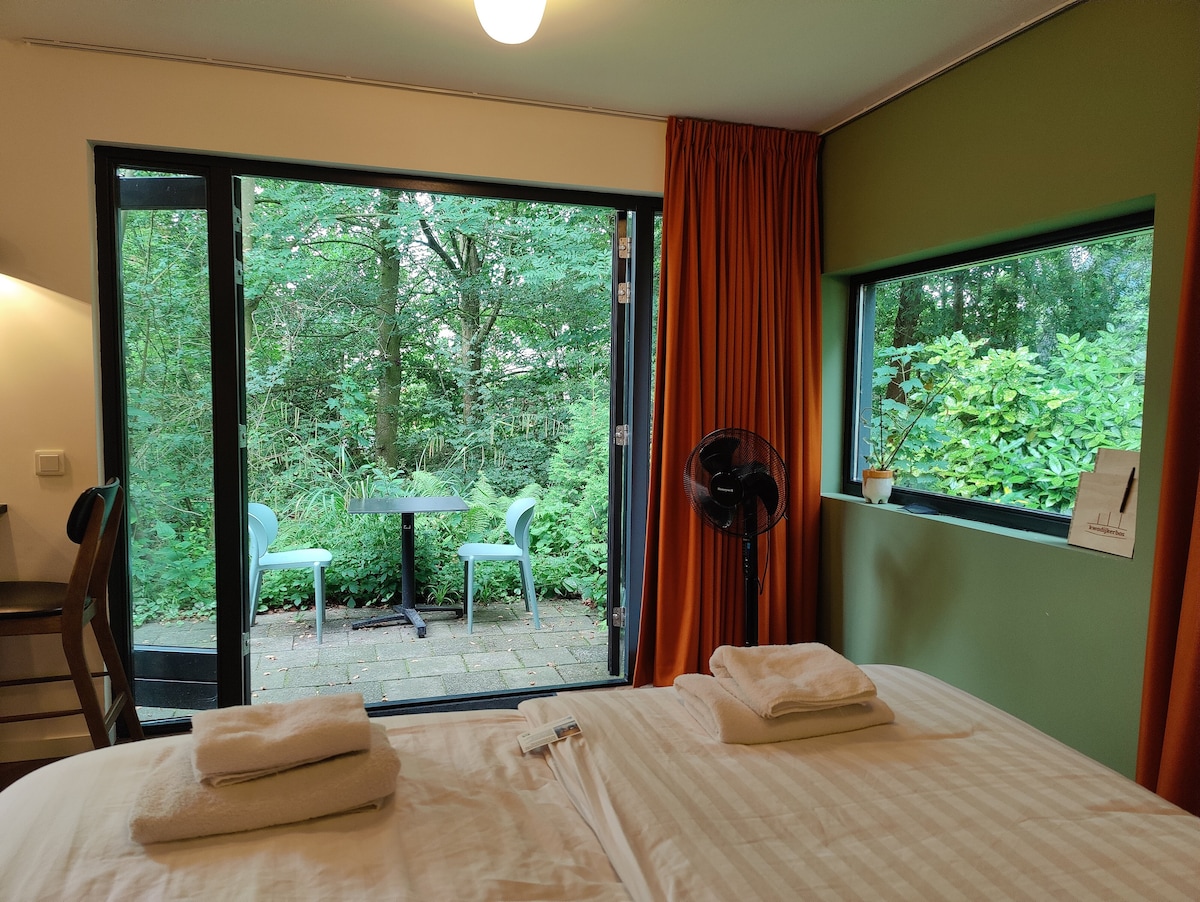 Situated in the countryside, a light and modern studio with amazing view. The studio has a queen size bed, bathroom and separate toilet. Airconditioned. It’s decorated with modern art and vintage details. From the studio you will step out on your private terrace. Studio offers free coffee and tea as well as free WiFi. Breakfast is available upon request (€12,50 per person). Situated 25 minutes from Amsterdam. Please note the studio is best accessible by car.