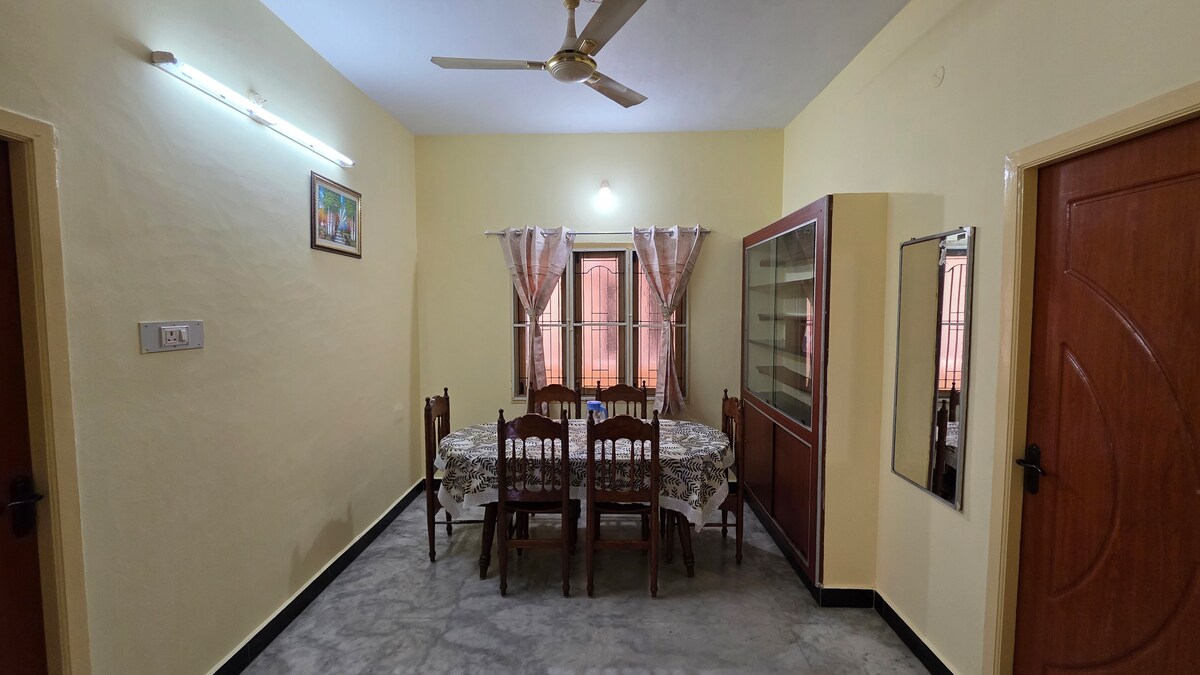 Welcome to Vasantha’s Home Stay -- a clean, peaceful and secure place for families and groups. Enjoy a spacious living room with Smart TV, large AC bedroom with 2 queen-size beds, dressing area and safe storage. Cook with ease in the fully equipped kitchen with a stove, fridge and utensils, while a washing machine is available for laundry. Includes an attached hot-water bathroom plus a common wash area. Secured with CCTV and a remote-operated gate, offering a safe home-away-from-home experience.