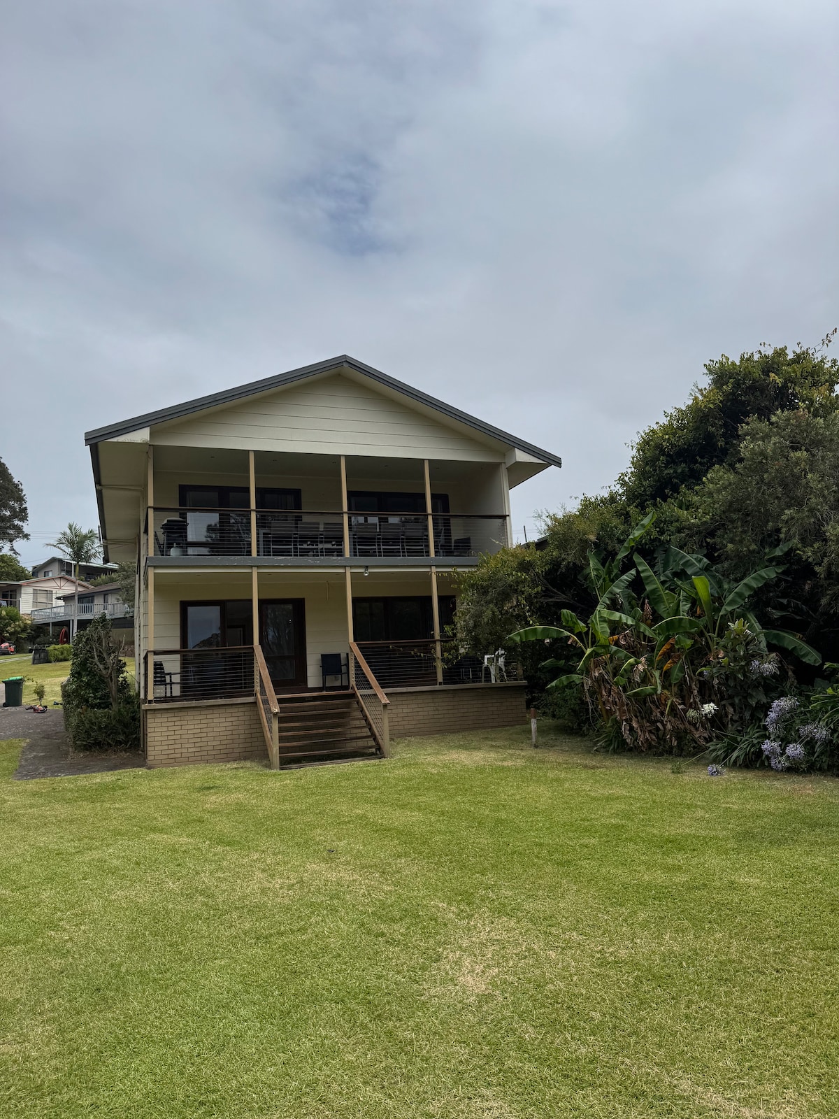 Best located property in Pambula Beach. Just completed full house renovation. Access pristine beach from the front garden without crossing any roads. Three bedrooms (one queen, two singles, 4 bunks). Brand new fully functional kitchen with dishwasher. New bathroom as well as en suite. Large lounge and dining room (flat screen TV and DVD player) with amazing beach and water views opening onto large deck with gas BBQ. Separate laundry with washing machine and dryer. Free Wifi. Books and games.