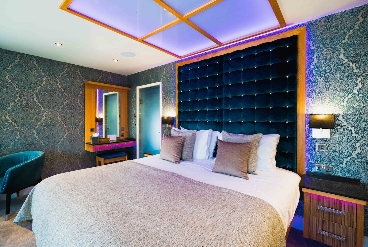 Relaxing is an easy task in our Opulence Suite. Sink into your luxurious super king size bed and enjoy one of your favourite films from our extensive movie collection on your very own 50″ television screen, or, if you’d prefer, watch and unwind in your sunken super sized air spa bath (big enough for two), complete with it’s own concealed 40″ television. Both activities can be done with a drink in hand from your complimentary mini bar…