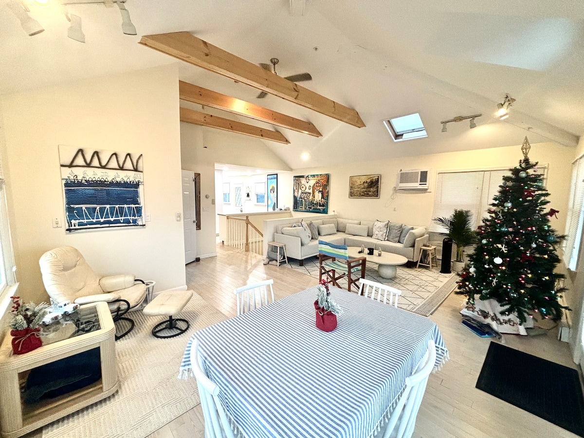 Enjoy ocean and bay views while sipping your favorite beverage from the elevated deck. Steps to Atlantic Ocean and walking distance to all shops, bars & restaurants on the trendy West End. Steps away from the Long Beach Boardwalk and all festivities. The listing is for the upper portion of the house, as seen in the photos. Easy train or ferry ride to NYC. Close to JFK airport. Beach passes, beach chairs, boogie boards and a beach umbrella provided. We allow guests that are 25 years old ++