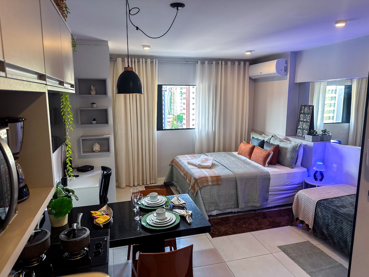 Apartamento-estúdio aconchegante situado na Ponta Verde, bairro nobre de Maceió. Localizado à 300m da praia, 650m da feirinha de artesanato da Pajuçara, 1,8km das piscinas naturais de Maceió e próximo a bares, restaurantes, supermercados e shoppings, está no coração de Maceió. O estúdio inclui Smart TV, wifi e banheiro privativo com chuveiro, secador de cabelo e ferro elétrico, enquanto a cozinha tem micro-ondas, geladeira, fogão, cafeteira ,sanduicheira, panelas,pratos, xícaras, taças vinho.
