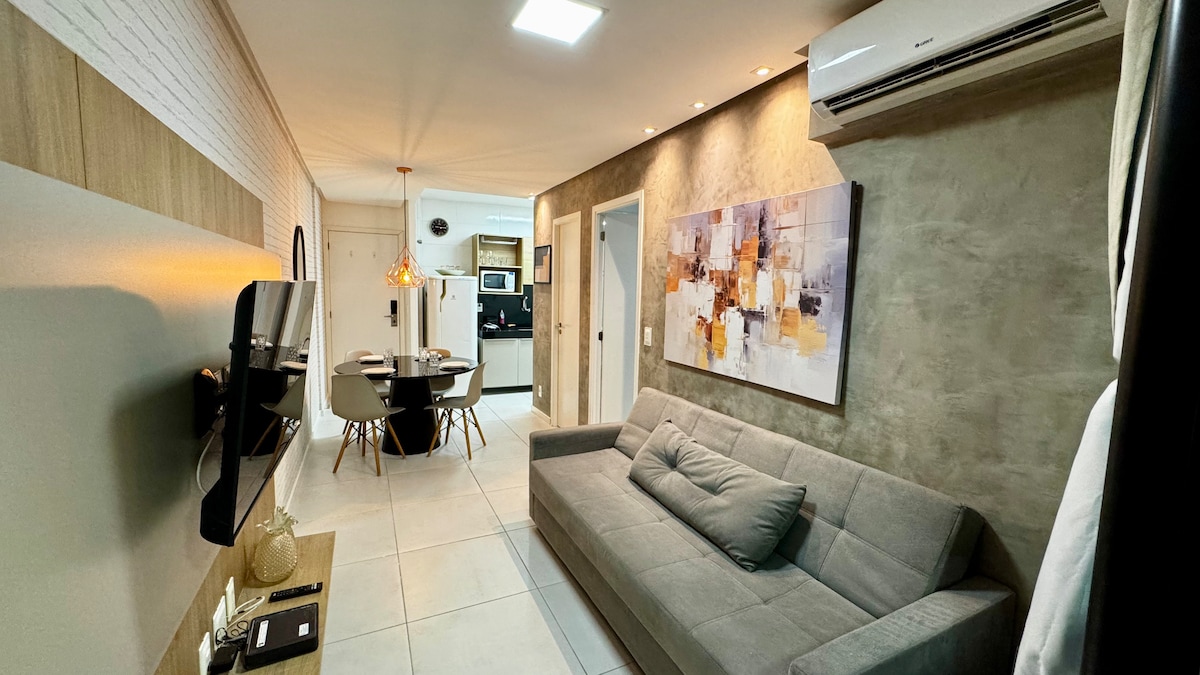 Very cozy apartment, located in the best neighborhood of Maceió. Located 200m from the beach, close to excellent bars, restaurants, supermarkets, bakeries, pharmacies and shopping. The building has: free parking (but rotating), swimming pool, gym, games room, gourmet space, home office, sauna and jacuzzi (sauna and jacuzzi, pay a fee by appointment). The App. it is located on the 13th floor, just one floor above the leisure area (which does not interfere with the silence of the room).