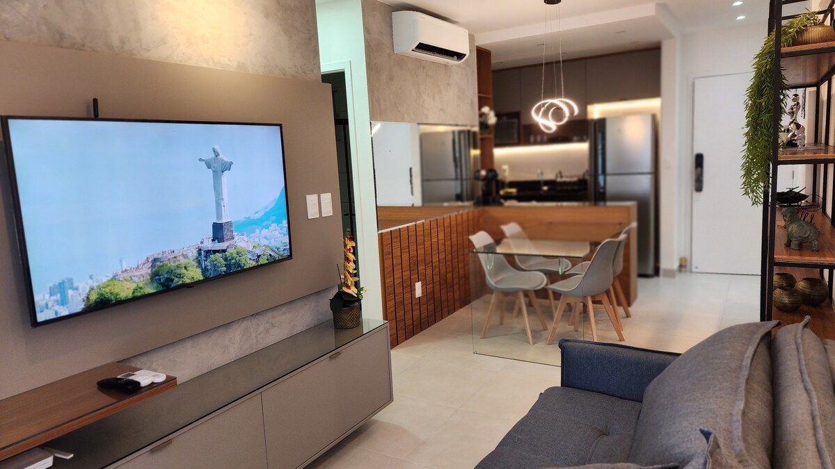 Totalmente equipado, suíte master com varanda, ar condicionado, smart tv e black-out, dormitório central com bicama de solteiro, ar condicionado e smart tv e black-out, sala com smart tv, wi-fi , ar condicionado, cozinha completa e garagem privativa. Condomínio clube com lazer completo em ótima localização, piscina panorâmica na cobertura, spa, sauna, academia, coworking, game zone, espaço kids, lavanderia OMO, churrasqueira, espaço gourmet, box para lavagem e tomada para carro elétrico.