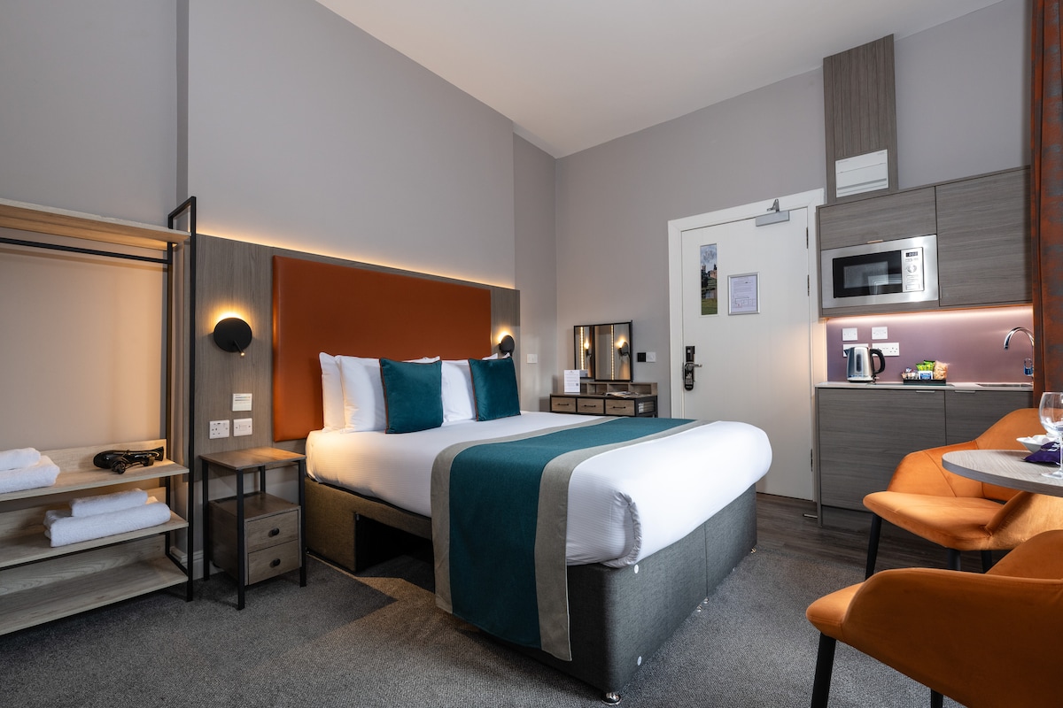 The Smart Studio at Roomzzz Aparthotel Edinburgh offers a compact yet stylish space, ideal for short stays. Measuring approximately 26 square meters, it features a cozy king-size bed, a modern en-suite bathroom, a fully equipped kitchenette, and a practical workspace. This well-designed studio provides all the essentials for a comfortable and convenient stay in the heart of Edinburgh.