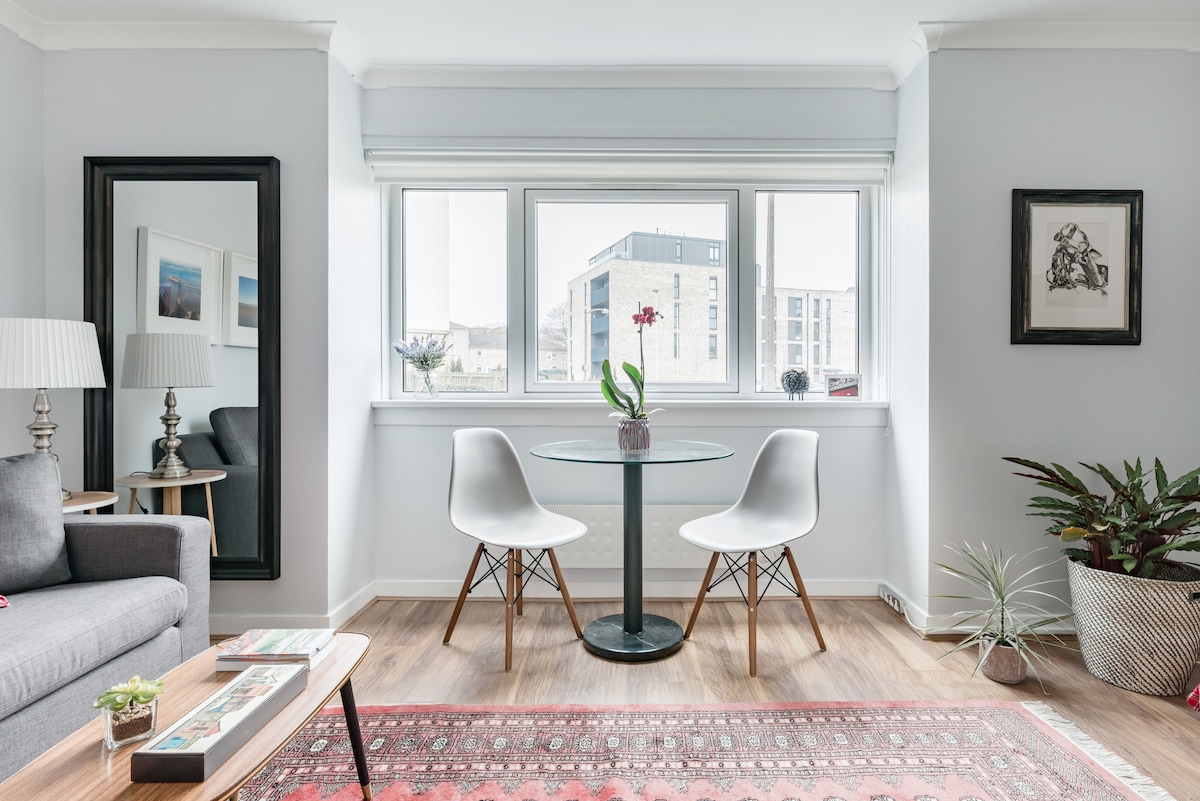 Spacious and bright rooms with large original sash windows provide a gorgeous light to this hidden Edinburgh gem a few steps away from the Royal Mile. The bedroom is fitted with king-size bed, feather bedding, and wooden window shutters to ensure the best sleep possible during your stay. Iconic Design Classics such as Jean Prouvé chairs, and Serge Mouille lamps happily co-exist with antique local finds. A beautiful & stylish retreat to escape to - we are sure you will love your stay.
