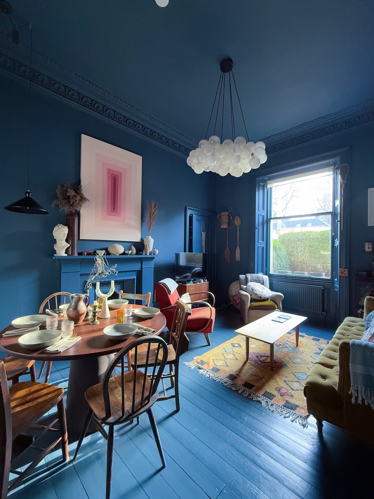 Spacious and bright rooms with large original sash windows provide a gorgeous light to this hidden Edinburgh gem a few steps away from the Royal Mile. The bedroom is fitted with king-size bed, feather bedding, and wooden window shutters to ensure the best sleep possible during your stay. Iconic Design Classics such as Jean Prouvé chairs, and Serge Mouille lamps happily co-exist with antique local finds. A beautiful & stylish retreat to escape to - we are sure you will love your stay.