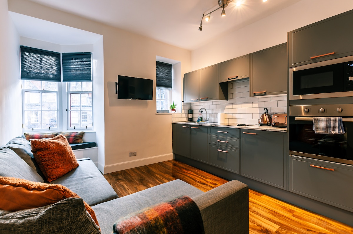 Bright, modern and cosy one bedroom apartment with stunning views of Edinburgh Castle which can be seen from every window. Situated in the heart of old historic Edinburgh within walking distance of all city centre attractions. Well equipped kitchen and comfortable bed. There are only 8 steps on the way into this apartment so this apartment works well for guests who are mobile but find stairs challenging.