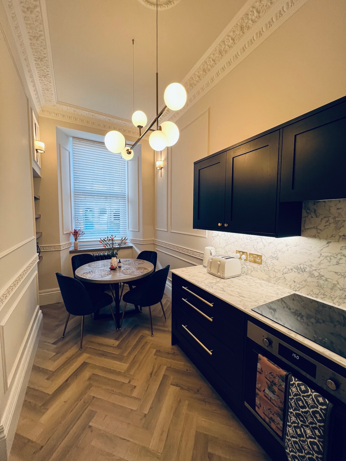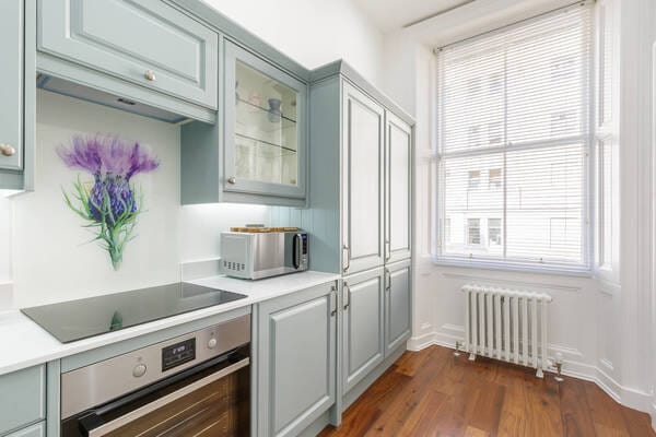 In the heart of the Historic New Town, The Butlers Basement is an interior designed 1796 Georgian home with private courtyard and access. The stylish one bedroom basement apartment next to the cathedral is ideally located for tourists, families and business travellers. A 15 minute walk from the castle and Royal Mile and a 2 minute walk to Haymarket train and Airport tram stations. The perfect space for up to 4 guests, the designed interior blends modern convenience with historic ambience.
