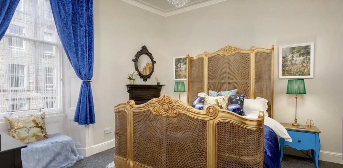 Lounge on a black leather sofa by a black fireplace in a flat full of curious angles and colourful accents. This fun and quirky space is a convenient base for exploring Edinburgh on foot. Return after a day's adventure to soak in a claw-foot bathtub. This private & secure main door flat really is at the centre of all thats happening in the New Town of Edinburgh & beyond. It's very rare to get a self contained flat with an exclusive front & back garden in the heart of the historic New Town. This property is on two levels. Great for families with children who can have freedom in the exclusive, enclosed back garden. Also great for some Al Fresco dining when the weather is good. Games console & board games are provided too! A real home from home. All internal areas. Exclusive front courtyard & back-garden. No access to locked external cellars. Contactable via email, or text. The flat is in the boho district of Stockbridge. Walk to boutiques, galleries, cafes, pubs, and restaurants. There are lovely historical walks around Dean Village and the Waters of Leith. Nearby Inverleith Park has plenty of green space. Walking, bus, tram, taxi. There is a bus stop on the corner and constant taxis passing by. 5/10 mins walk to the tram which takes you direct to the airport, and approx 10/15 mins walk to Waverley Train Station. Because this is a Conservation Area, Category A listed property, original features like the Georgian single glazed windows are standard. The flat is in one of the best streets in Edinburgh, Royal Circus. On the edge of the boho district of Stockbridge. Walk to boutiques, galleries, cafes, pubs, and restaurants. There are lovely historical walks around Dean Village and the Waters of Leith. Nearby Inverleith Park has plenty of green space.