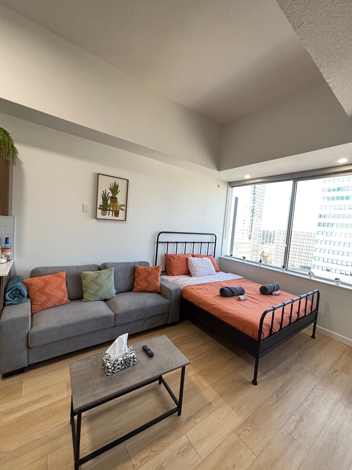 A fully equipped kitchen and cozy furnishings are perfect for longer stays. Use the pool and gym to maintain your excercise routine while you're travelling. Enjoy easy access to everything from this perfectly located home base. Take in stunning views of the city skyline from the balcony. You are just steps away from some of the city's best restaurants, cafes, and entertainment venues, walking distance to Rogers Place, MacEwan University and a quick transit to the University of Alberta.