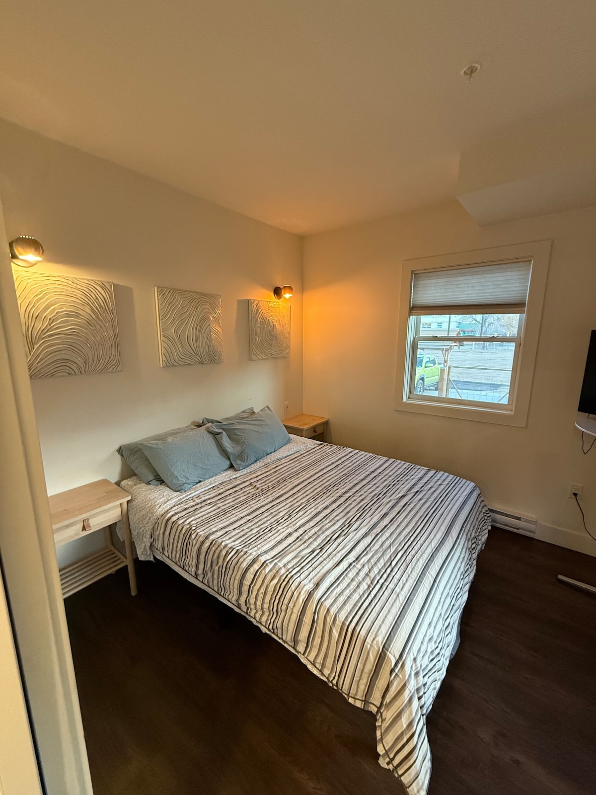 Step into a stylish yet cozy one-bedroom apartment that blends retro elegance with modern comforts in a non-smoking building. Designed for relaxation and style, featuring fun wallpaper, this space features warm wood and sleek upgrades. A thoughtfully designed kitchen with a full-size fridge, induction stovetop, and convection oven is perfect for cooking everything from quick bites to full meals. A king-sized bed and a sofa bed (sleeps two) are available, making this space perfect for a family.