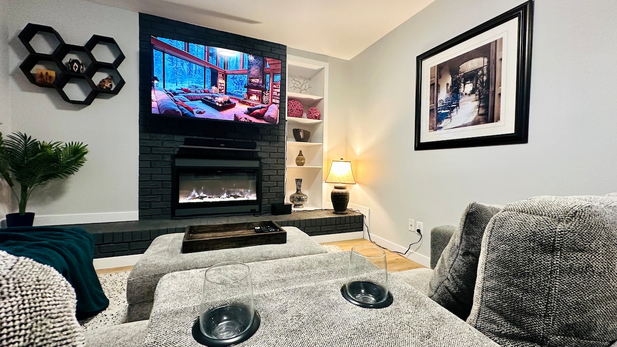 Relax and unwind in this spacious and stylish cozy suite with a view. This space is a walk-out basement suite with a private entrance, two TVs, pillow-top queen bed, dart board, kitchen, heated floors in the bathroom, rain shower, laundry, private patio, fenced-in yard, and access to a hot tub. The suite is located in the heart of St.Albert, with walking distance to all amenities, parks, and trails, and a short 20-minute drive to West Edmonton mall. Small dogs can be accommodated.