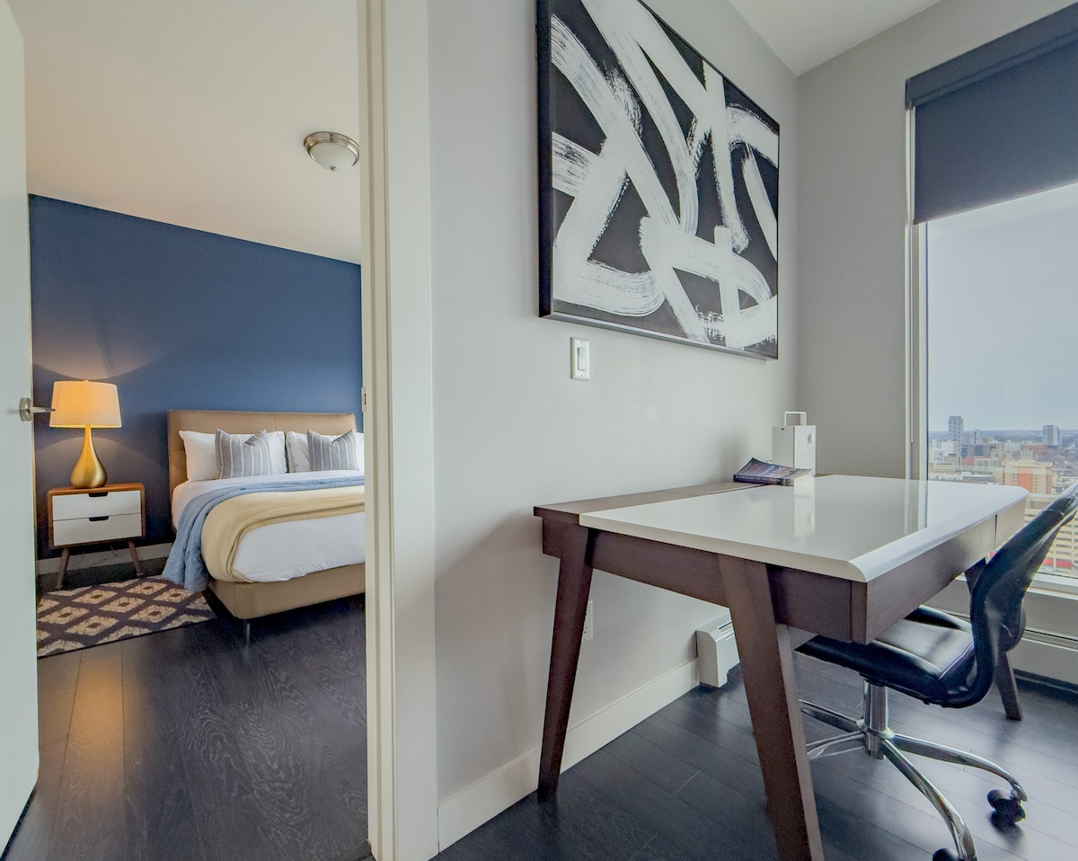 A fully equipped kitchen and cozy furnishings are perfect for longer stays. Use the pool and gym to maintain your excercise routine while you're travelling. Enjoy easy access to everything from this perfectly located home base. Take in stunning views of the city skyline from the balcony. You are just steps away from some of the city's best restaurants, cafes, and entertainment venues, walking distance to Rogers Place, MacEwan University and a quick transit to the University of Alberta.