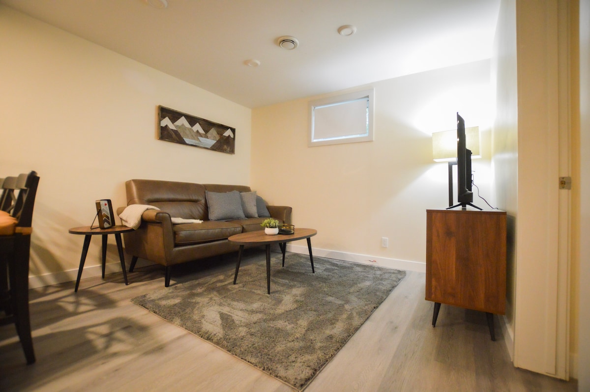 Our newly-renovated and romantic NYC loft-inspired basement suite offers over 1000 square feet of luxurious living space. With its high ceilings, floor-to-ceiling glass walls and French doors, and cozy in-floor heating, you'll feel like you're in a real loft. The high-end kitchen and bathroom add a touch of sophistication, and the 90s Simpsons arcade game provides hours of entertainment. Book your stay with us and experience the luxury and comfort of our suite.