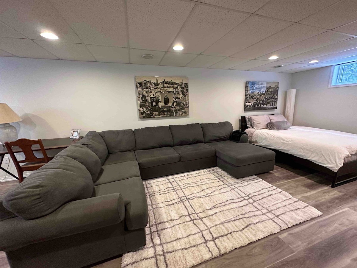 Our newly-renovated and romantic NYC loft-inspired basement suite offers over 1000 square feet of luxurious living space. With its high ceilings, floor-to-ceiling glass walls and French doors, and cozy in-floor heating, you'll feel like you're in a real loft. The high-end kitchen and bathroom add a touch of sophistication, and the 90s Simpsons arcade game provides hours of entertainment. Book your stay with us and experience the luxury and comfort of our suite.