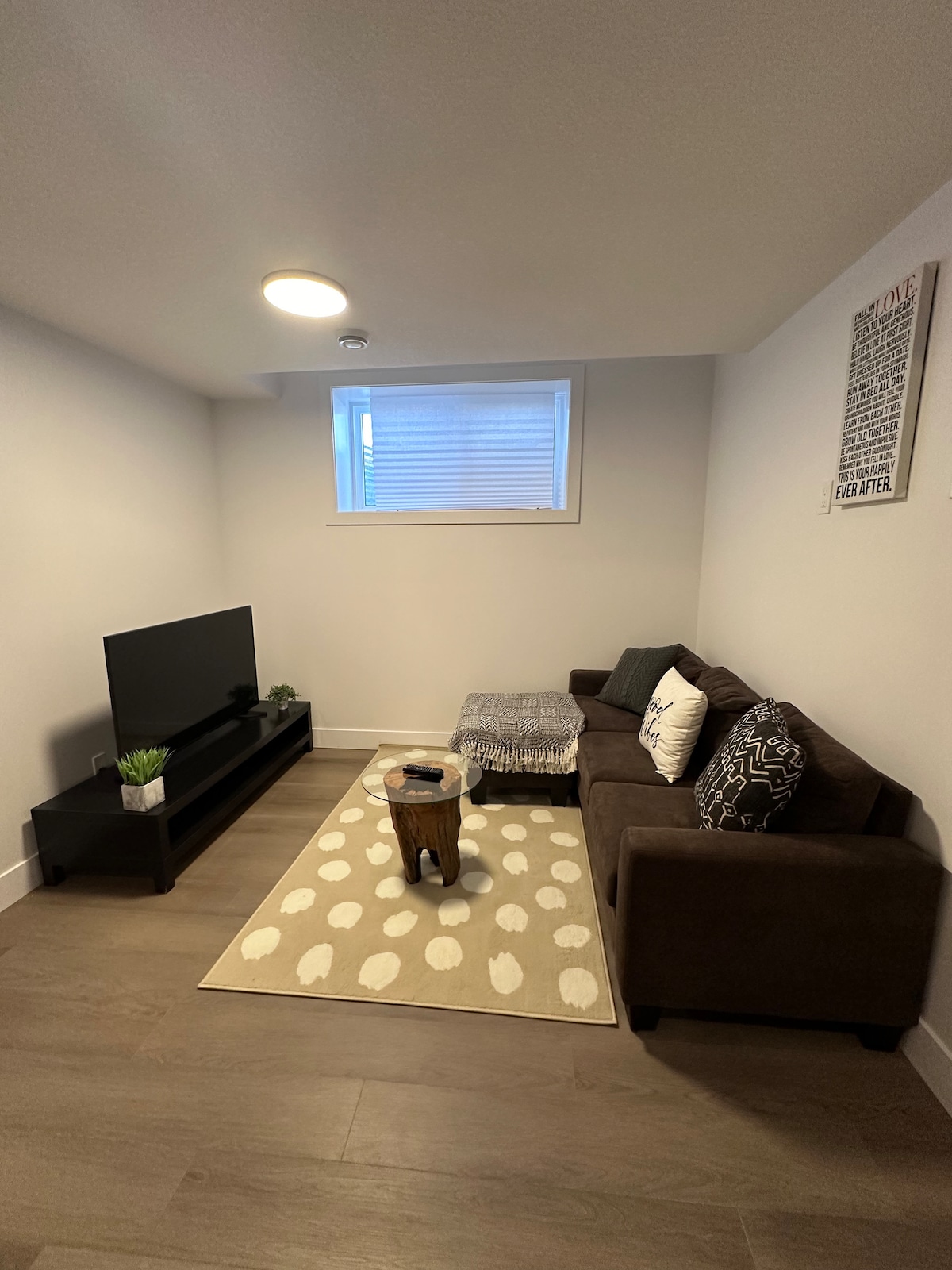 This beautifully renovated, bright, 700 square foot, one bedroom basement suite is located in the heart of Old Strathcona. Located just off Whyte Ave, there are restaurants, coffee shops, pubs and trendy shops all within walking distance. Discover nearby walking and biking trails in Edmonton's river valley (North America's largest stretch of urban parkland) only two blocks away with access through Mill Creek Ravine. A fold down couch is in the living room and is more suitable for children.
