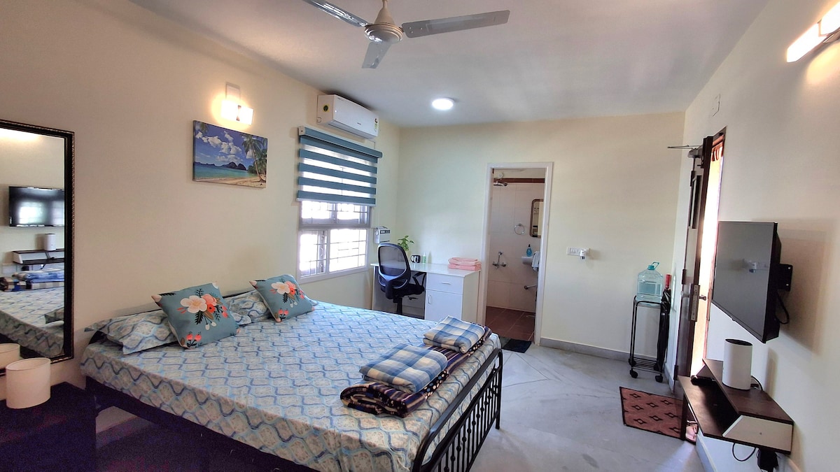 Ideal for long stays in Central Chennai.Alwarpet ,Teynampet ,T nagar. Perfect for business travellers, US Consulate appointments,Apollo Hospital visits and corporate relocations. Private terrace penthouse studio with attached bathroom, Split AC,TV, high-speed Wi-Fi, dedicated work desk with ergonomic chair,fridge and microwave. Ideal for solo travellers,working professionals and Couples.Located in a safe residential area close to shops, cafés,restaurants. peaceful home in the heart of the city.