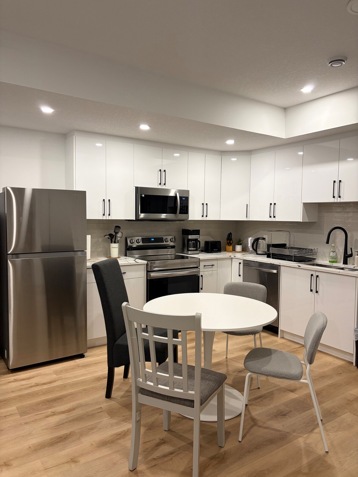 Enjoy a stylish and quiet experience at this centrally located place. 10 min drive to downtown and 1hr 23min to Banff. Contemporary appliances, designer furnitures, and a fully supplied whole kitchen! Stream movies and shows on our high-speed wifi and experience our excellent guest service that meets all your needs. Keyless self check-in through emailed guide makes entrance flexible and easy. Parking is free and always reserved for you. Visitors can park on the street for free.