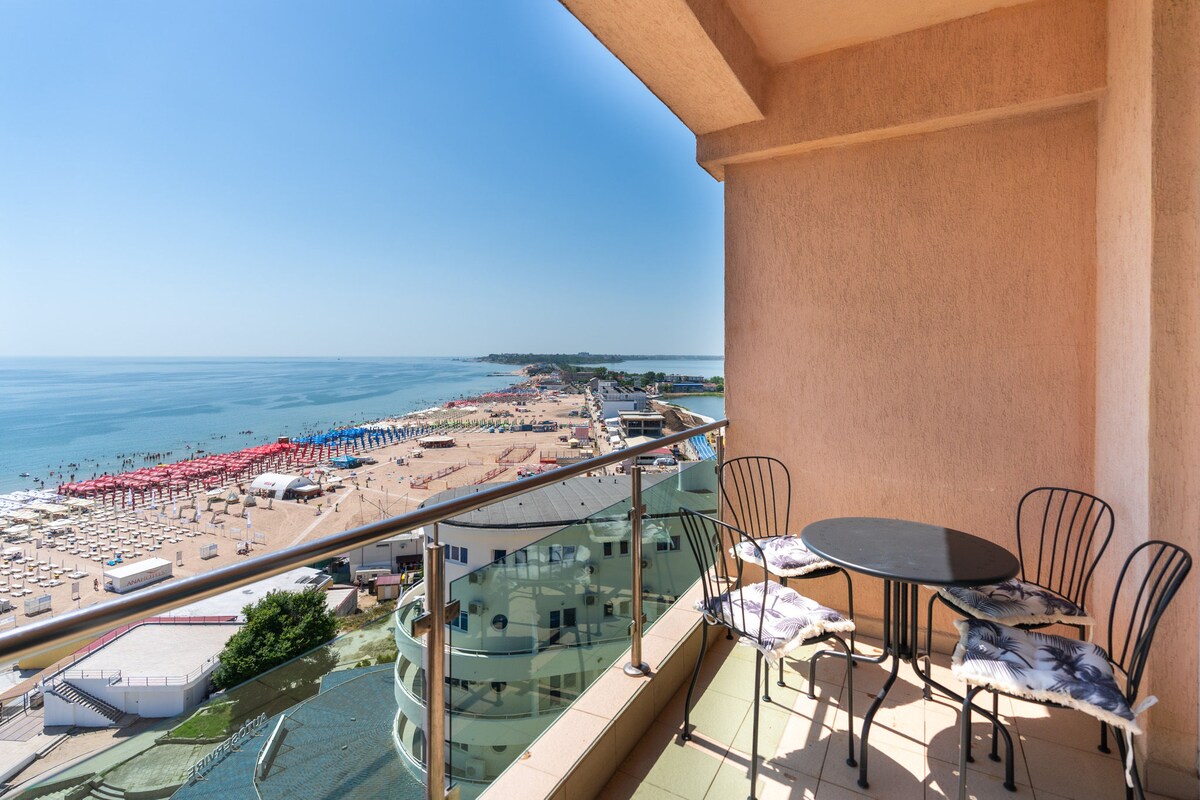 Un studio elegant , modern si primitor pe piata imobiliara de vacanta ,cu iesire la plaja cuprinsa intre Acapulco si Steaua de Mare , la 5 minute de mers pe jos de faleza unde se coboara pe plaja , este dotata complet pentru o vacanta in familie la mare .Poate constitui un punct de plecare eficient spre diferite puncte turistice din zona : Techirghiol 2km , plaja salbatica Tuzla 10km , Costinesti 15km, Mangalia 35 km , Vama Veche 35 km, plaja salbatica Vadu 42km si Corbu 35km.Vacanta cu soare !