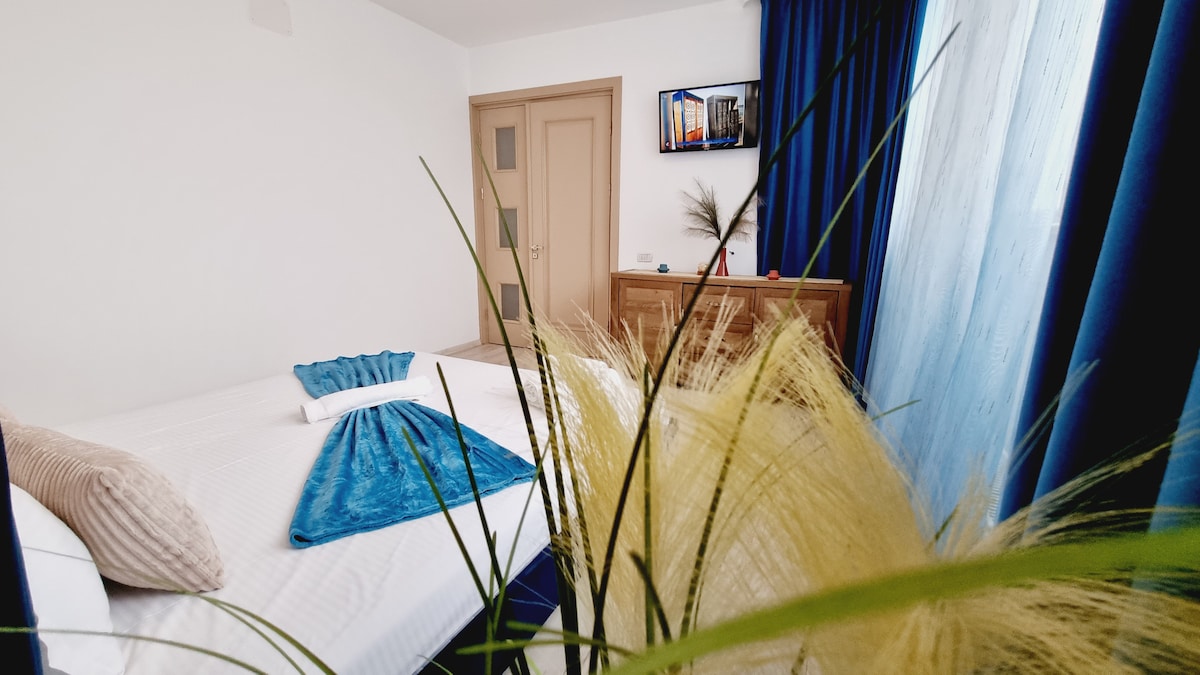 This Blue Pearl is situated in the quiet place of Eforie Nord( South Side) You have 10 minutes walking to the nearest beach ( Roxi Beach) and the most beautiful beaches with turqoise water are in the south part . For 2 minutes walking you find Supermarket Lidl in the left side and in the right side it is the Train Station ! 5 minutes walking to the park , 10 minutes walking to the Center !