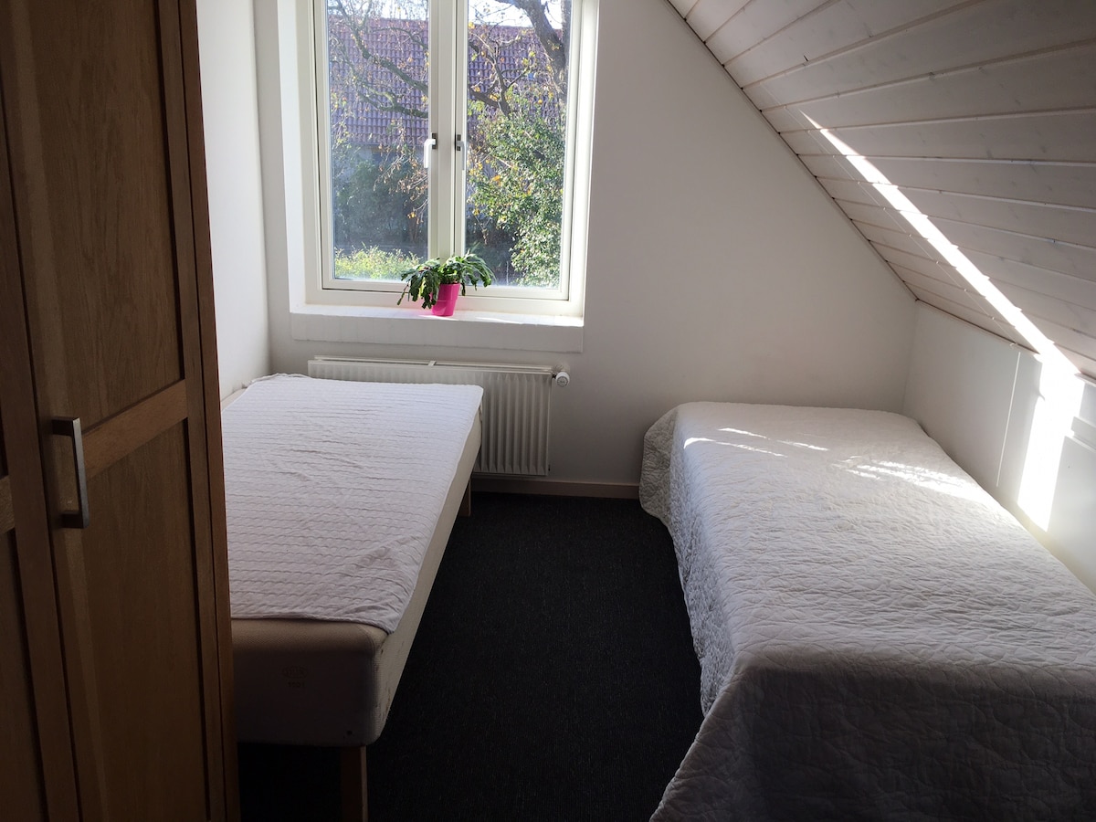 Møblerede værelser på 1.sal i ny villa bestående af 2 værelser, veludstyret køkken og bad med egen vaskemaskine. Trappen op til førstesalen benytter værten af og til. De andre ting har lejer for sig selv.