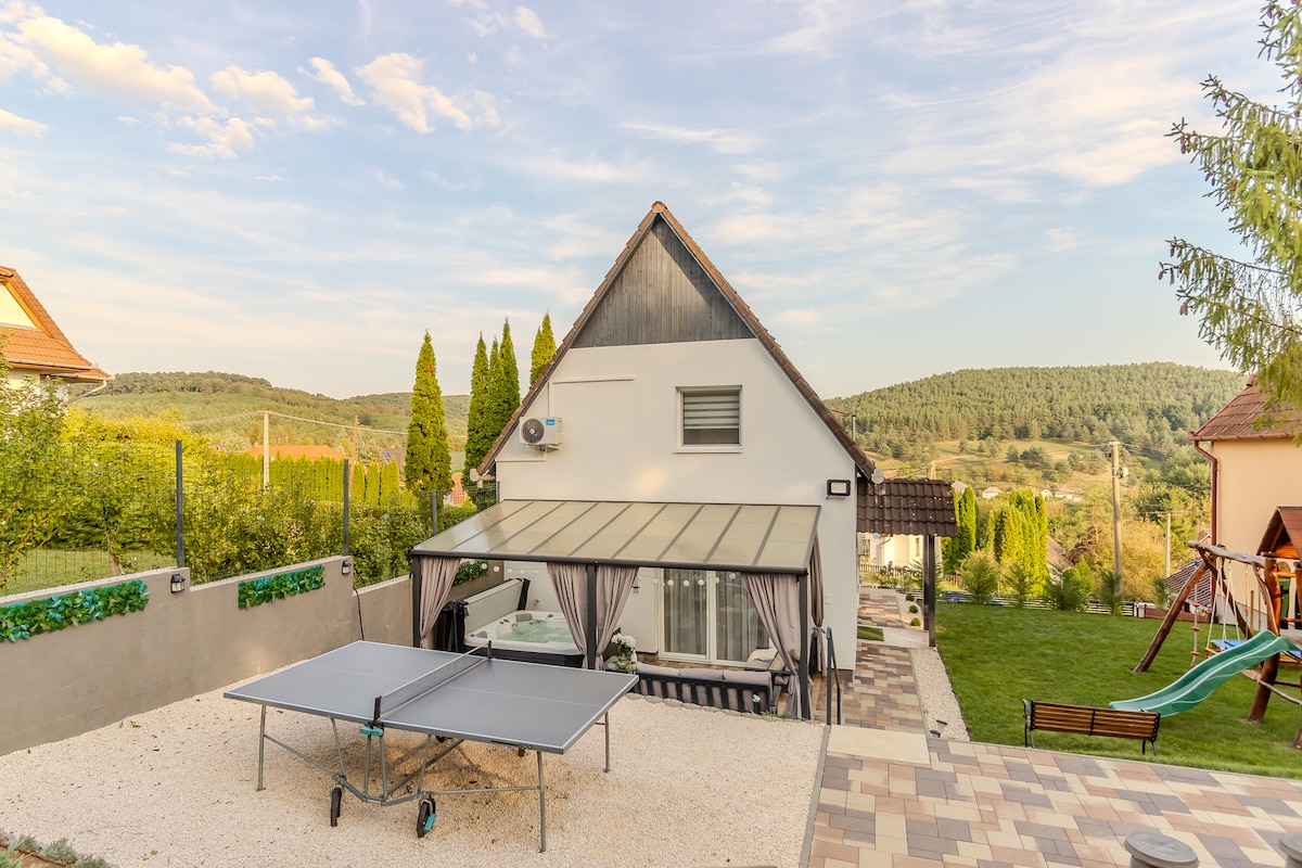 Hozd el az egész családot, a barátokat erre a nagyszerű helyre, ahol sok lehetőség van a szórakozásra, kikapcsolódásra, pihenésre, feltöltődésre. Korlátlanul használhatod a szaunát,a jakuzzit,a wifit,nézheted a síkképernyős TV- t mindhárom szobában és a nappliban, felfrissülhetsz a két fürdőszobában,lazulhatsz a nappaliban a kanapén,elkészítheted a kedvenc ételedet a felszerelt konyhában,kávézhatsz a teraszon, sütögethetsz a kertben, csobbanhatsz a jakuzziban,és a gyerekeket várja a játszótér.
