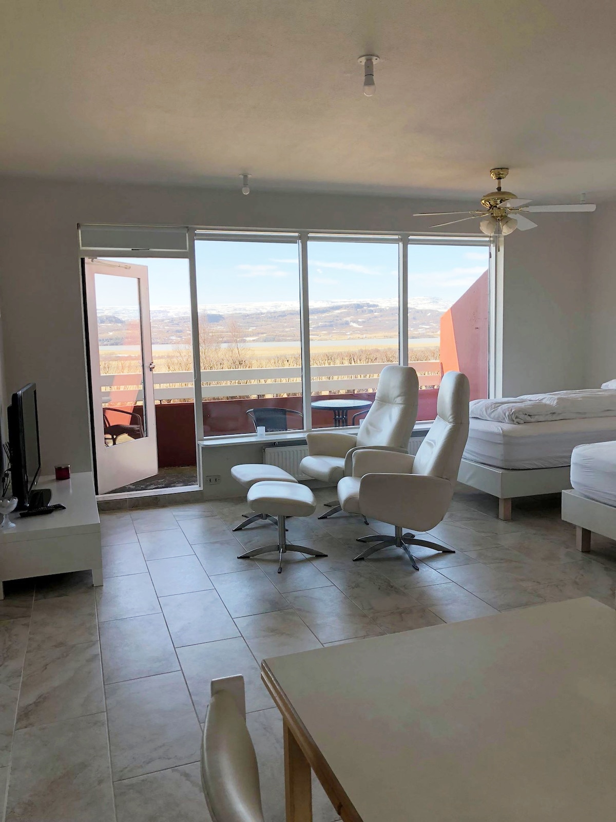 A cozy two bedroom apartment with a beautiful view in Egilsstadir, the biggest community in East Iceland. Egilsstadir is well located with all services. You will find grocery stores and good restaurants nearby. The apartment is on fifth floor with a great view over Egilsstadir town and Lake Lagarfljot which supposedly hosts the infamous monster worm “Lagarfljotsormurinn". The apartment sleeps four in two bedrooms, the kitchen is open into the living room and well equipped. Self check in.
