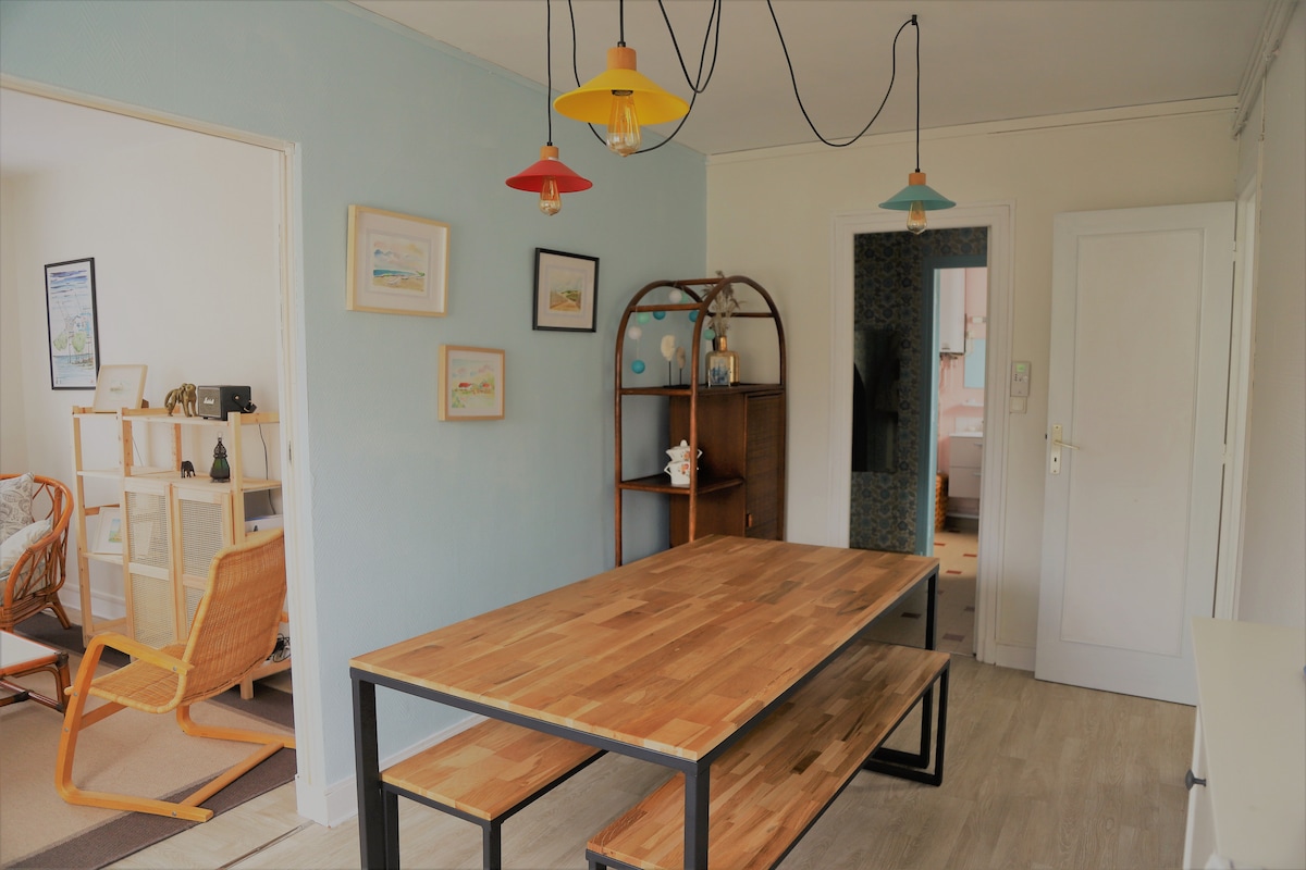 Appartement idéalement situé au cœur de Royan dans petite résidence 1950 très calme au 1er étage grand escalier ( sans ascenseur). Marché central à 100m, plage à 300m. Logement entièrement rénové en 2019. Ensoleillé et traversant il dispose de tout le confort pour votre séjour royannais. Place de parking dédiée pour les périodes de forte affluence.