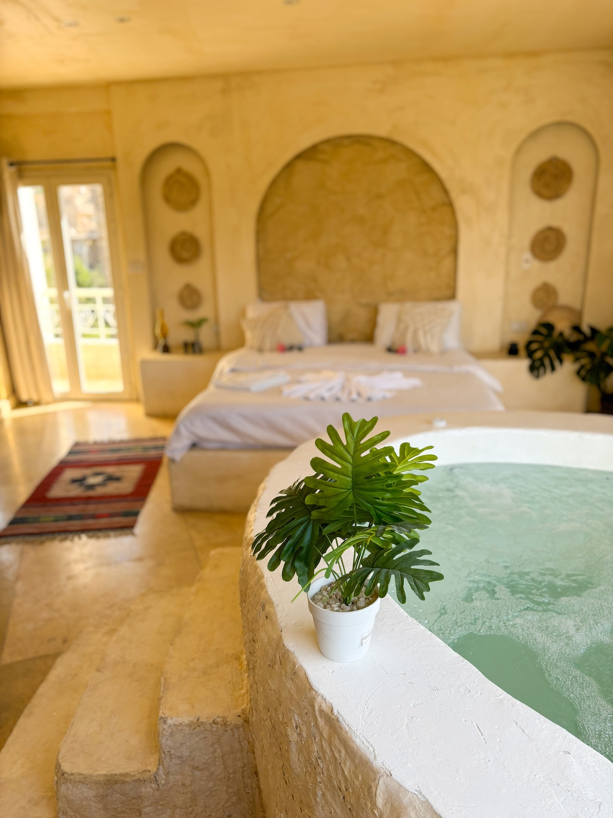 Looking for a serene retreat in Siwa? Welcome to your hidden desert gem nestled among palm trees. Warm desert days and cool nights are perfectly balanced here with a custom designed Siwan shaped pool for daytime dips and a cozy fire pit for evenings. You can enjoy stargazing and a view of the date palm forest from our spacious roof deck. For a unique culinary experience, our house chef can prepare and deliver delicious Siwan food right to your door. Embrace nature and unwind with us!
