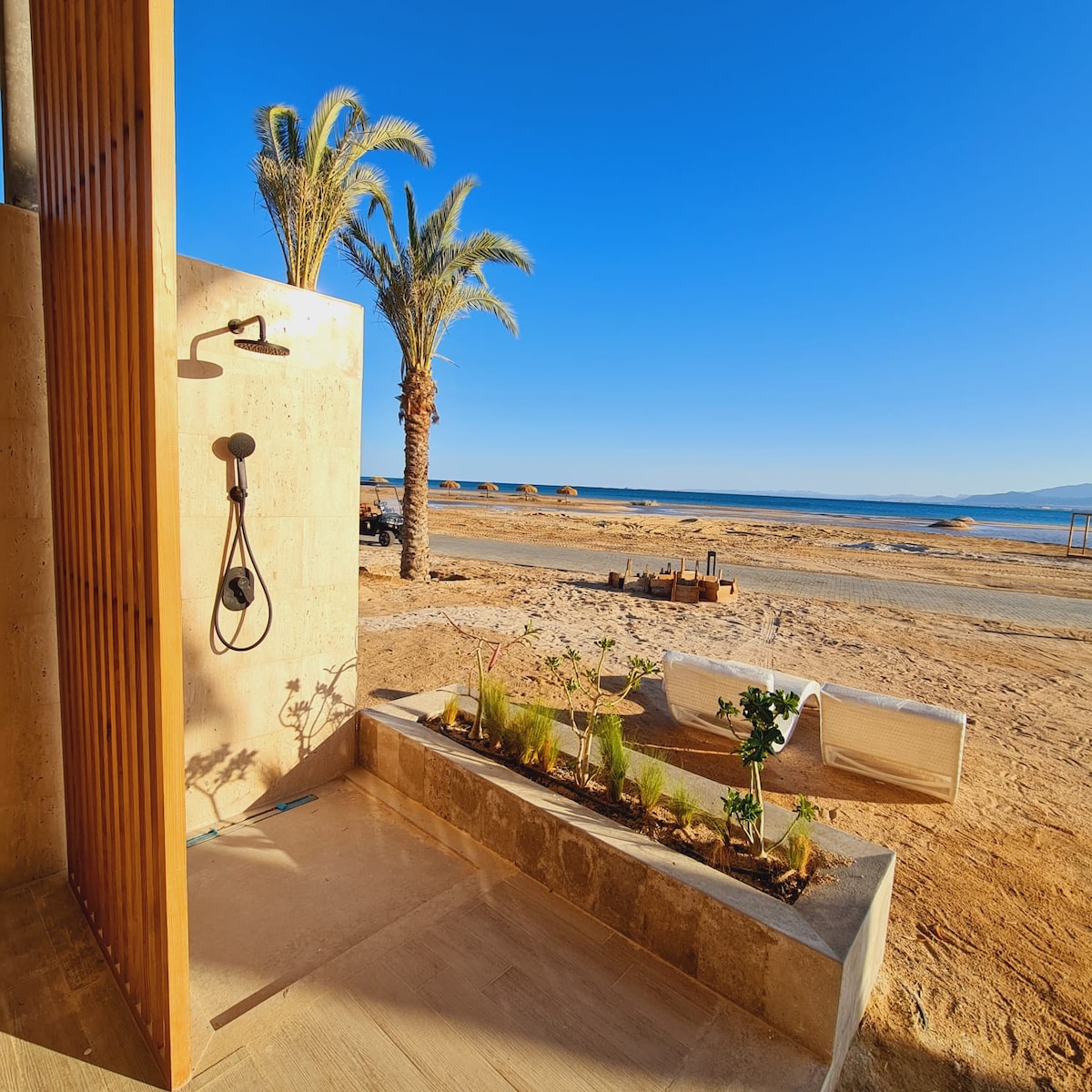 Step into your peaceful beachfront chalet and head up to the huge, sunny private rooftop terrace where sweeping panoramic views of the Red Sea greet you. Located right on the seafront, this space offers direct access to the beach and a vibrant coral reef just a few steps away — perfect for swimming, snorkeling, or simply enjoying the ocean. Whether you want to relax in the sun, explore the underwater world, or enjoy local dining nearby, everything you need is within easy reach.