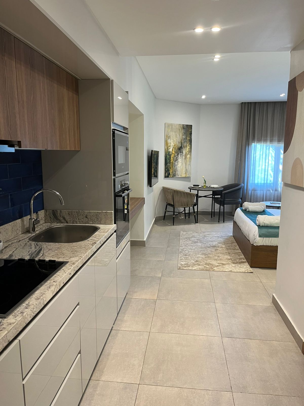This newly renovated and stylish studio is in the heart of El Gouna Maria/Ocean View Apartments. This apartment is on a high floor and boasts stunning mountain views. Centrally located in the heart of everything! Restaurants, Banks, Bars, Clubs, Shopping, Supermarkets, and much more are just steps away. Elevator in building, no need to worry about carrying your luggage up and down stairs. King bed, fully equipped kitchen, lots of closet space 55'' Smart TV, Netflix, WIFI, Triple Play