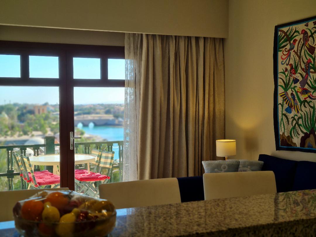 Stylish 1 BD 2 bath is in the heart of El Gouna Maria/Ocean View Apartments. This apartment boasts stunning Marina and Sea Views. Centrally located in the heart of everything! Restaurants, Banks, Bars, Clubs, Shopping, Supermarkets, and much more are just steps away. Elevator in building, no need to worry about carrying your luggage up and down stairs. Large bedroom, fully equipped kitchen, lots of closet space Smart TV, Netflix, WIFI, Triple Play