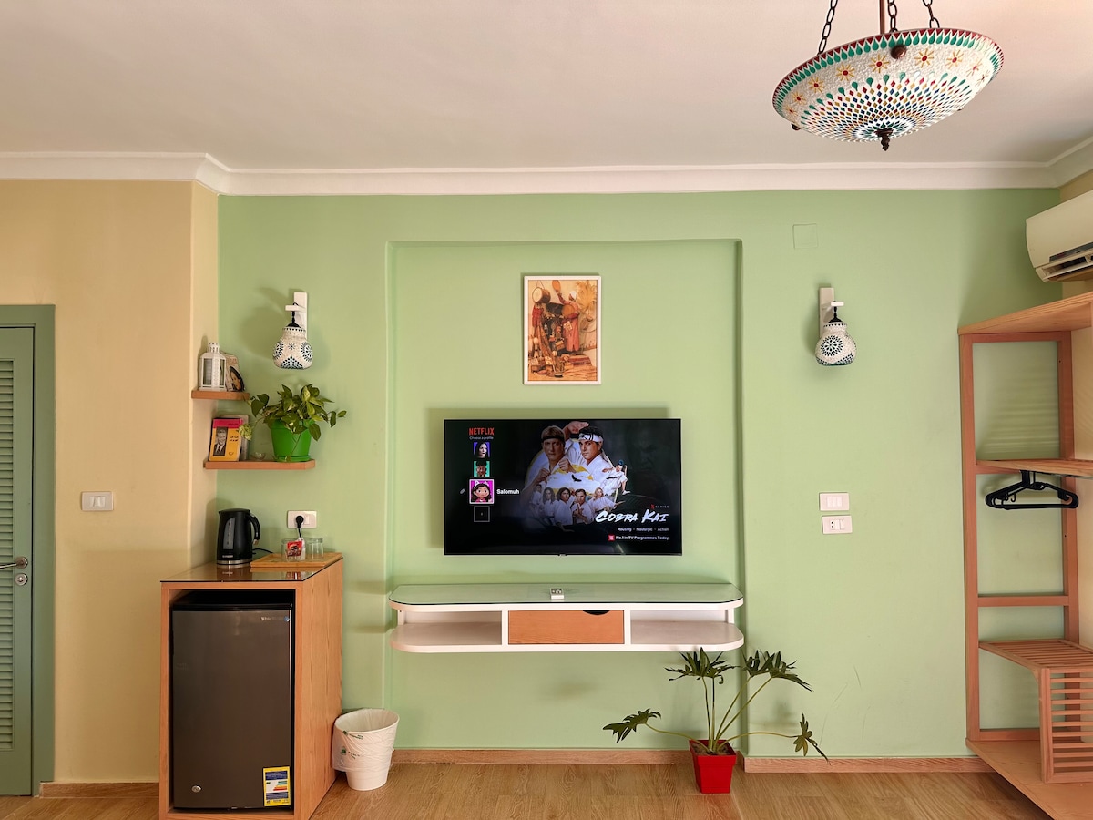 Enjoy a private, fully air-conditioned guesthouse on Luxor's West Bank, featuring a cozy living room, bedroom, private bathroom, and fully equipped kitchen. Relax on your private balcony or rooftop terrace, and take a dip in the shared pool. Just minutes from ancient sites like the Valley of the Kings and Hatshepsut Temple. Elegant, quiet, and perfect for a comfortable stay near history.
