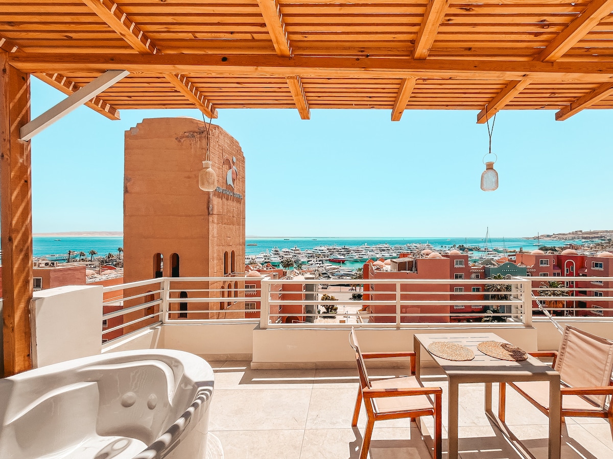 Erlebe Rooftop-Living pur in diesem neuen, boho-chic Apartment direkt hinter der New Marina in Hurghada! Highlight ist die freistehende Badewanne auf der großen privaten Terrasse – mit traumhaftem Blick über Marina, Berge & Meer. Perfekt für Sundowner oder relaxte Abende. Das Apartment bietet eine voll ausgestattete Küche, schnelles WLAN, Aufzug und zentrale Lage – ideal für Paare oder Freunde, die das Besondere suchen.