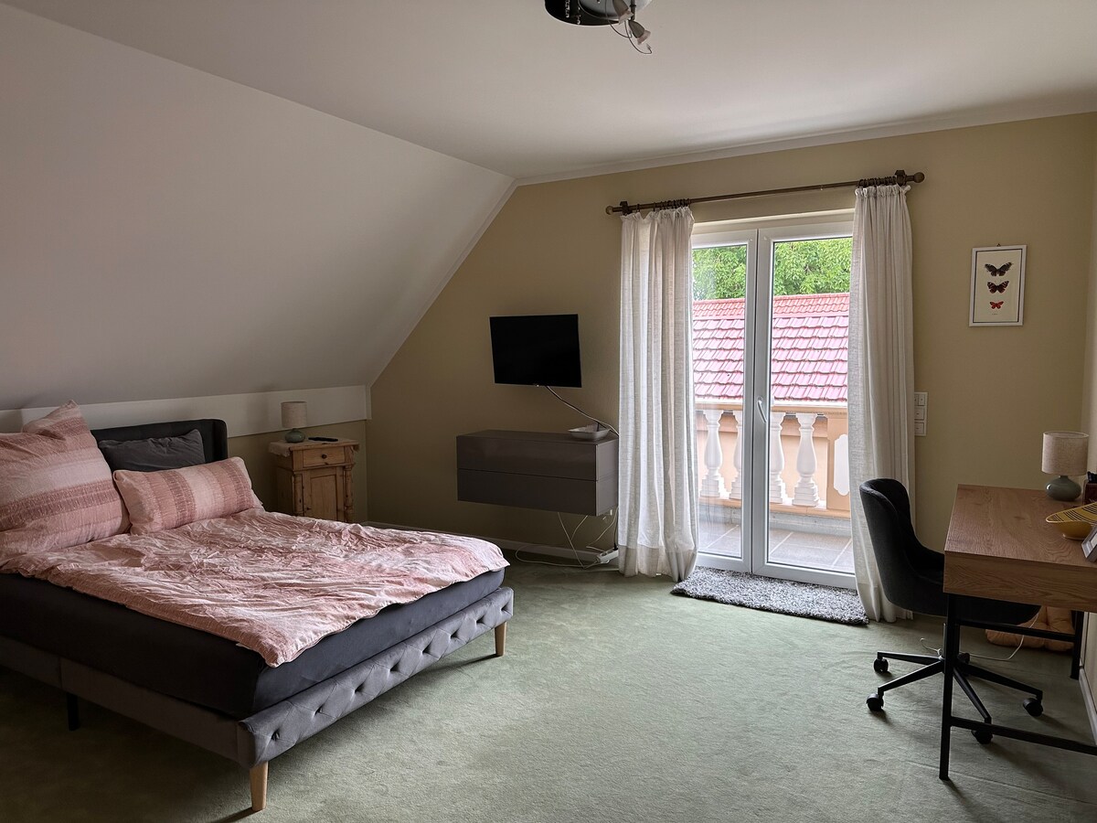 Wir vermieten unser großzügiges Nichtraucher-Gästezimmer im neu ausgebauten Dach unseres Hauses, mit Vorraum, Dusche/WC, Kabel-TV, Teeküche (Wasserkocher), Kaffeemaschine, Mikrowelle und kleinem Kühlschrank. Wir stellen Essgeschirr zur Verfügung, aber es besteht nicht die Möglichkeit zu kochen. Geeignet für bis zu vier Erwachsene, Babybett auf Wunsch möglich. Einkaufsmöglichkeiten, Schwimmbad Titania und öffentliche Verkehrsmittel in der Nähe.
