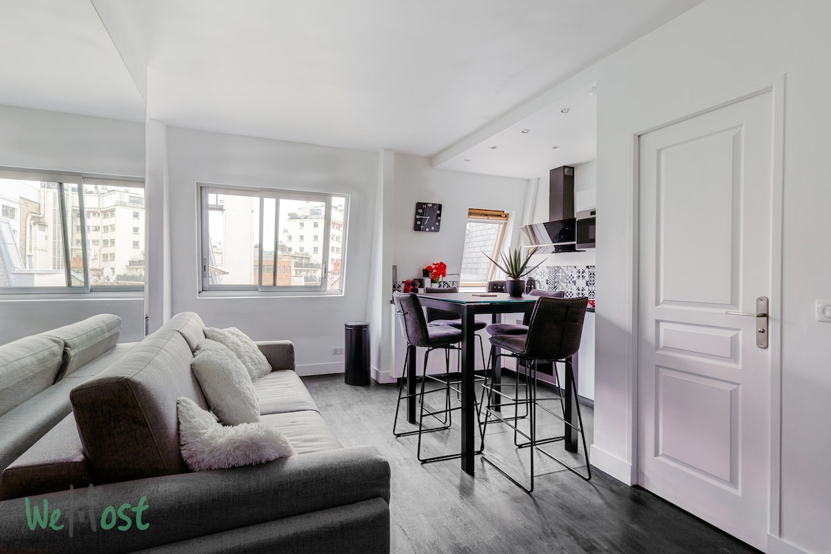Top-floor haven with a large, sunlit balcony and an unobstructed Eiffel Tower view. Newly refurbished by a designer, it features an Italian shower, a comfy queen-size bed, and a quality sofa bed for groups of 3–4. Bright living/dining area, fast broadband and Netflix. Secure building in a vibrant neighborhood packed with cafés, restaurants, and shops. Metro station just 2 minutes’ walk. Perfect for couples, friends, or business stays.