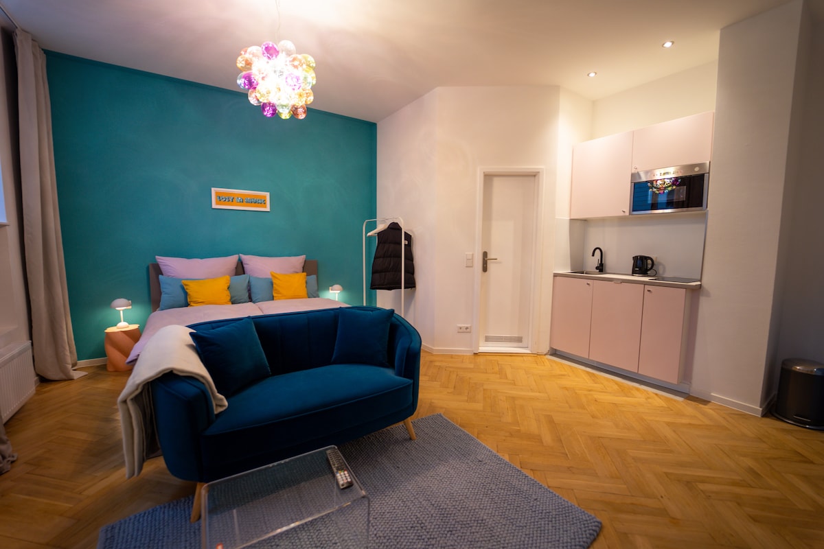 Unser Apartment "Hanoi" ist 50 qm groß und besteht aus einer vollausgestatteten Küche und einem Wohn- Schlafbereich. Die Wohnung liegt sehr ruhig zum Innenhof und verfügt über einen großzügigen Balkon. • 22 Min. Fußweg vom Hauptbahnhof • 10 Minuten Fußweg zum Marktplatz • vollausgestatte Küche • großzügiger Balkon • Waschmaschine • Boxspringbett • Dusche • Restaurants und Supermärkte direkt nebenan • Stellplatz im Parkaus (3 Min. fußläufig entfernt) für 10 € pro Tag