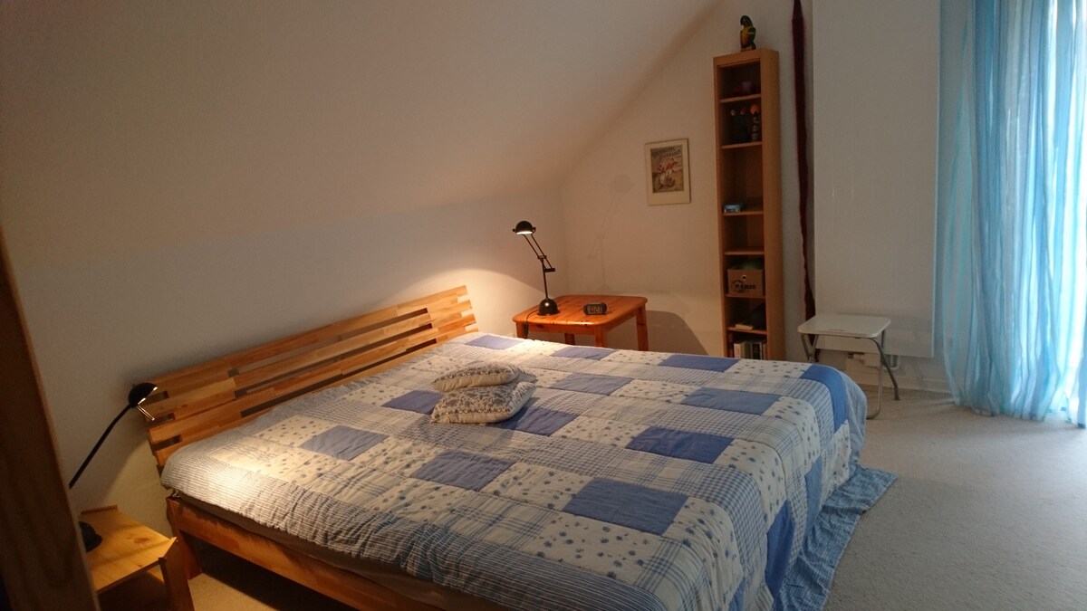 Im früher als Praxis genutzten Anbau unseres Hauses steht euch dieses Studio zur alleinigen, privaten Nutzung zur Verfügung. Neben einem kleinen Flur mit Schuhschrank und Garderobe befindet sich das kleine Badezimmer mit WC und Dusche. Im großen, hellen Wohnraum gibt es eine kleine Küchenzeile (aber KEINE vollausgestattete Küche) mit Spülbecken. Ein umklappbares Sofa bietet Platz für eine dritte Person. Hinter einer mittelhohen Trennwand befindet sich das Doppelbett direkt am großen Fenster.