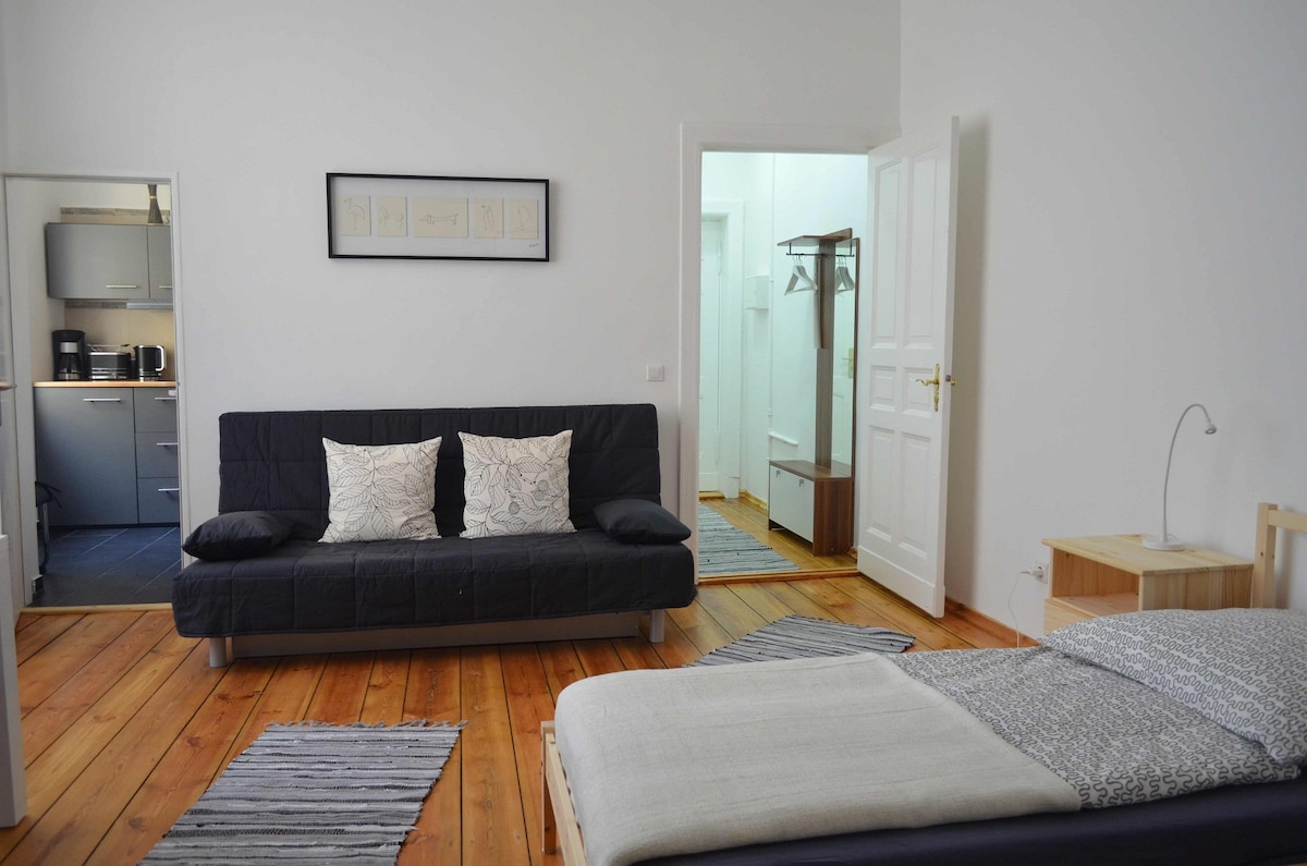 Our freshly renovated apartment in the heart of the famous district Prenzlauer Berg offers you the true Berlin feeling: located in a charming old building on a cobbled street, famous historic sites and beautiful cafés are just around the corner. The wifi is fast and the apartment works fine as a homeoffice as well.