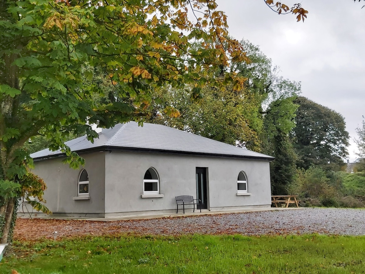 The Clonmellon Lodge is an 18th c. gothic mini castle recently restored, newly refurbished bathrooms and kitchen, all in one floor, with easy access to the grounds of Killua Castle. The Lodge can fit 5 people comfortably. There are 2 bedrooms with ensuite bathrooms. The first one with an ( American) Queen size bed, and the second with a double size bed. There is an office with a daybed that can sleep an small adult comfortably, and it has a full bathroom next to it.