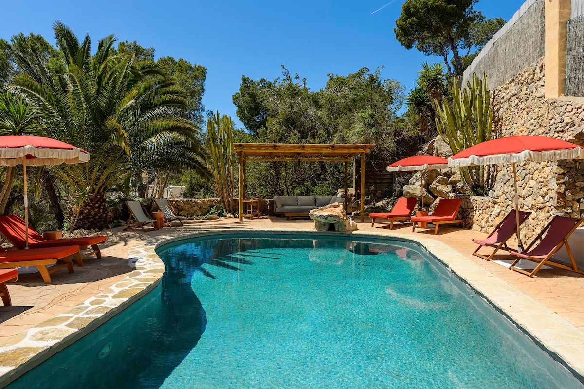 The best place to experience the real Ibiza! This finca is a hidden gem, but in a super central location! Private and spacious guesthouse, You have a beautiful 360° view from sunrise to sunset, with an accommodation of 125 m², for 6 people, and an outdoor area of 4 hectares, including a saltwater pool, jacuzzi, outdoor gym & yoga deck, barbecue area, pool bar and children's playground. Animals & fruit trees. Close to many famous hotspots, the most beautiful beaches and the best restaurants!