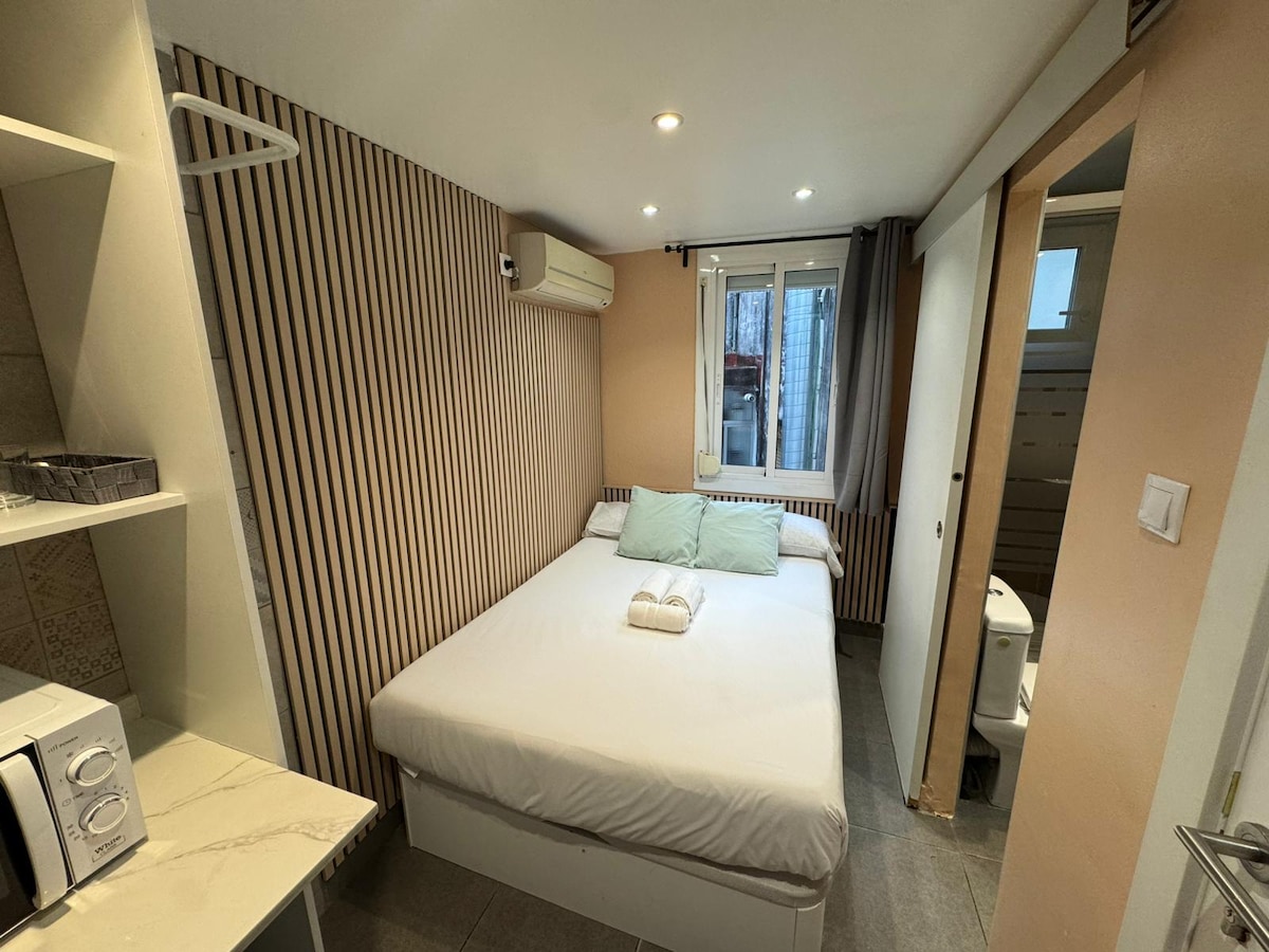 EXCLUSIVE STUDIO IN BADALONA, NEXT TO THE BEACH. IT´S ABOUT AN OPEN SPACE WITH SMALL KITCHEN, DOUBLE BED, A COMPLETE BATHROOM, AIR CON. (We can adapt an auxiliary bed for children, but we don´t recommend it for long stays, the space is so fair) MEDITERRANEAN NICE DESIGN ATMOSPHERE!! Beach (4min.Walk), Barcelona center (20min by tube), Prat airport (1h by tube)... You´ll love the space and charming deco. Very suitable for couples!! Perfectly equipped to enjoy the beach and the city of Barcelona!.