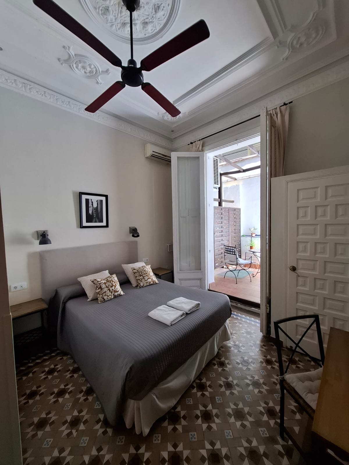 Triple Room balcony/terrace & shared bathroom (Breakfast Included) Triple rooms are bright, air-conditioned room offers a balcony, a flat-screen TV. They have shower and sink in the room but a shared toilet in the hallway. This room has a sofa-bed for an adult. Some have a small balcony overlooking Girona street and others a small terrace over a large courtyard. All are very bright. Tourist taxes 5,5€ per person/night are not included in the price