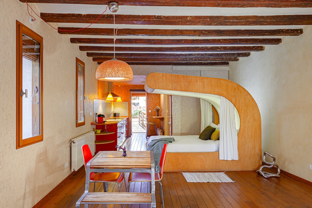 Private Bed-Lamp loft is part of shared "Casa Solaris", a unique, mostly solar-powered, green and arty house in Barcelona, featuring stylish lofts using eco-friendly materials, as well as a patio and terraces. Sagrada Familia is next to. Tourist tax due separately : 6,88€/night/guest, maximum 7 nights.