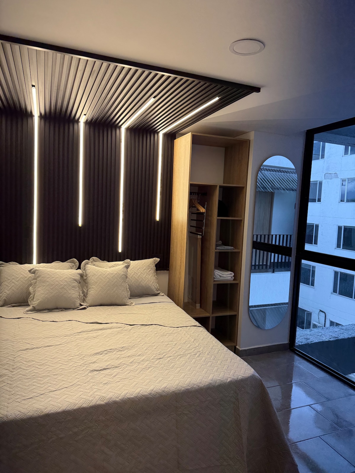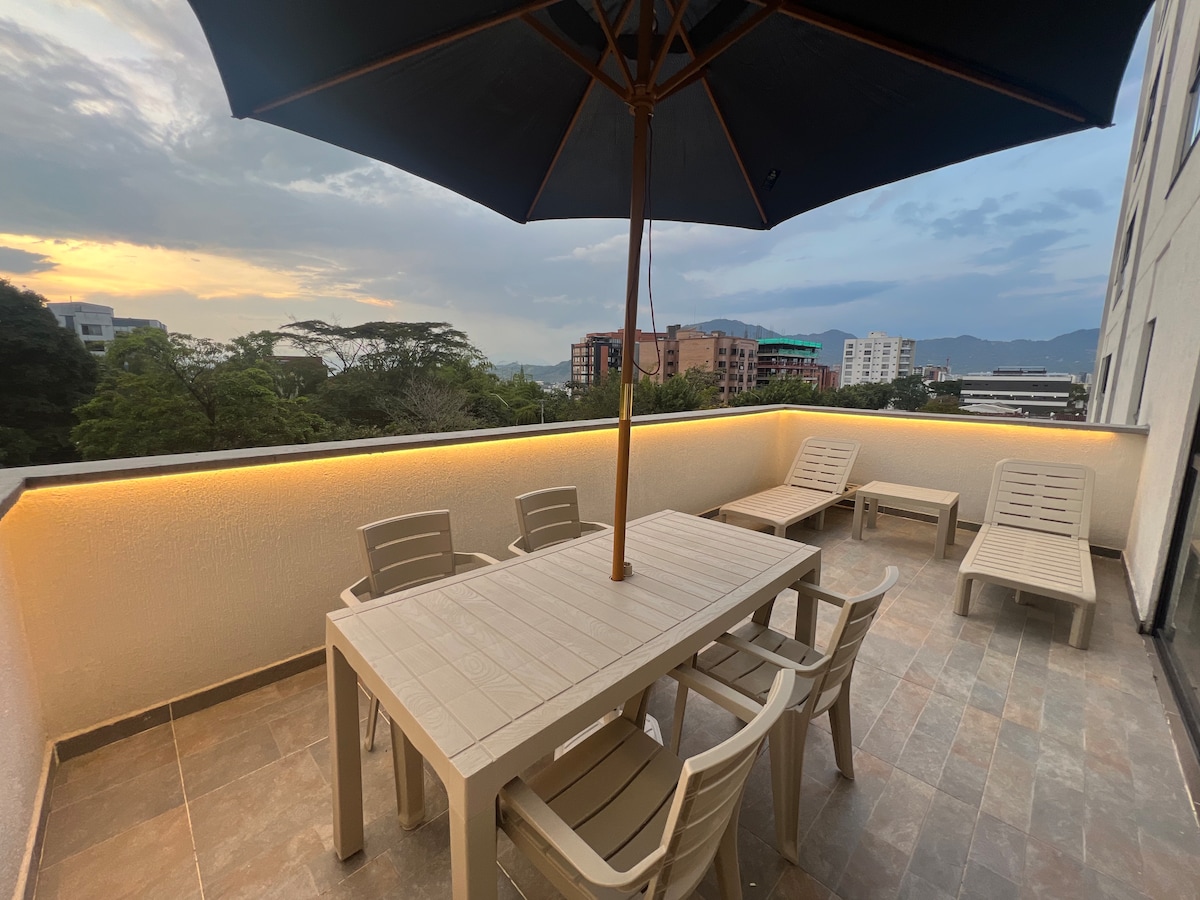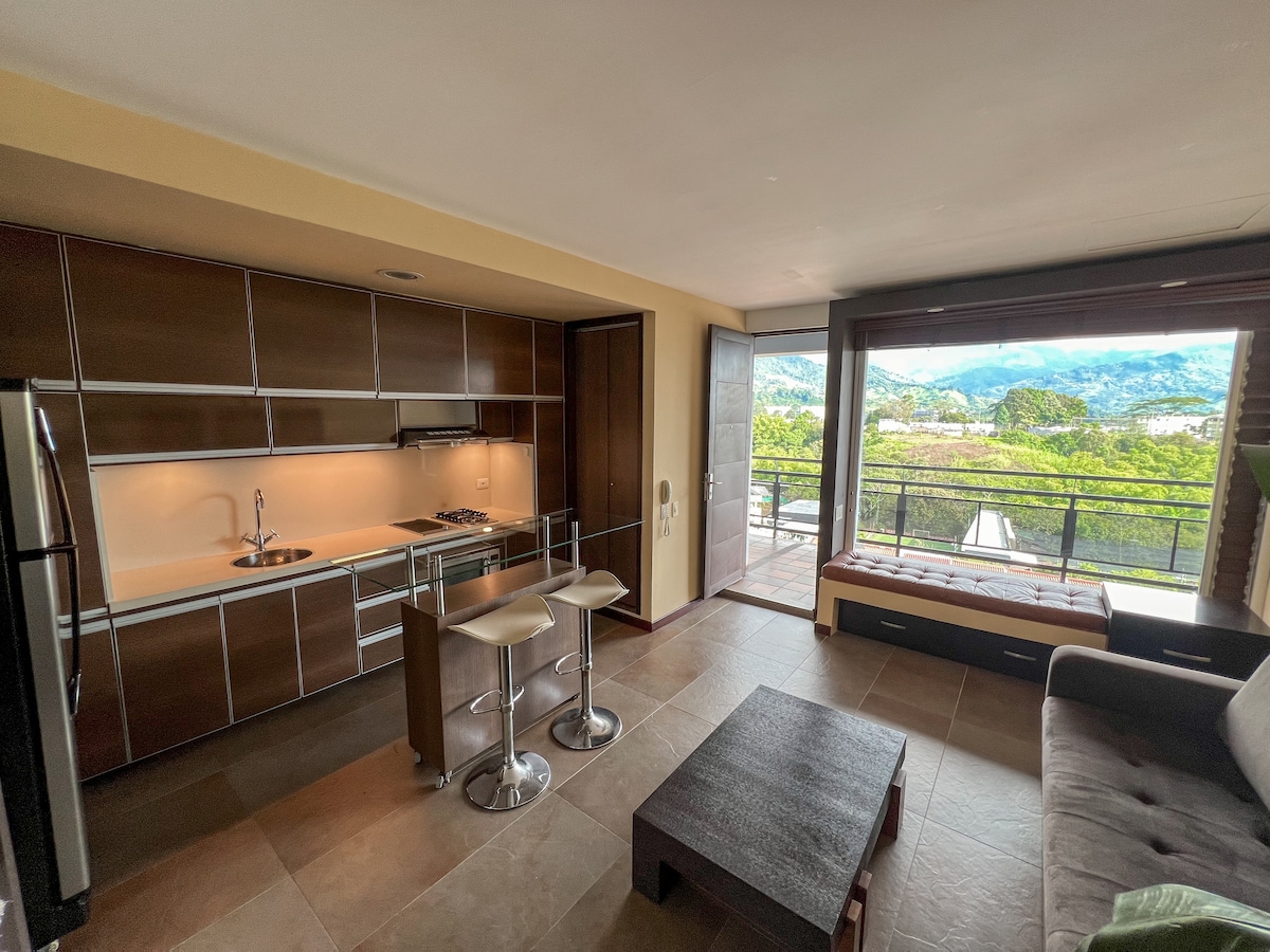 Relax and enjoy a comfortable and modern space. Watch your favorite movies or series on a 4K TV without leaving the bed. Share a glass of wine on the balcony while admiring a beautiful view of Pereira. You’ll be just steps from Circunvalar, surrounded by restaurants, cafés, and bars. Explore the Coffee Region with our guidance. The building offers a pool, washer, dryer, and an ideal location close to Megacentro Pinares.