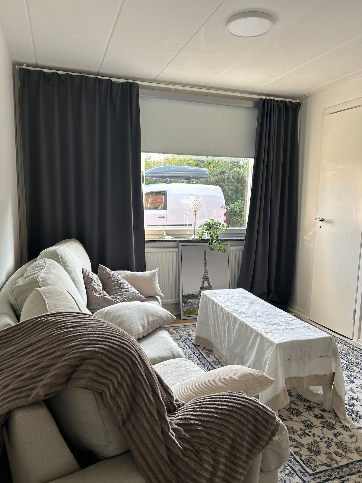 We rent a spacious, bright and fully furnished 1 bedroom apartment of 52sqm in our house from the 70's. The apartment has its own entrance and is completely renovated with fine modern materials. The entire apartment is equipped with underfloor heating under the light gray concrete floor which extend through the entire apartment. New modern kitchen from Ballingslöv with everything you need to cook for one or more people. The apartment has an open floor plan.