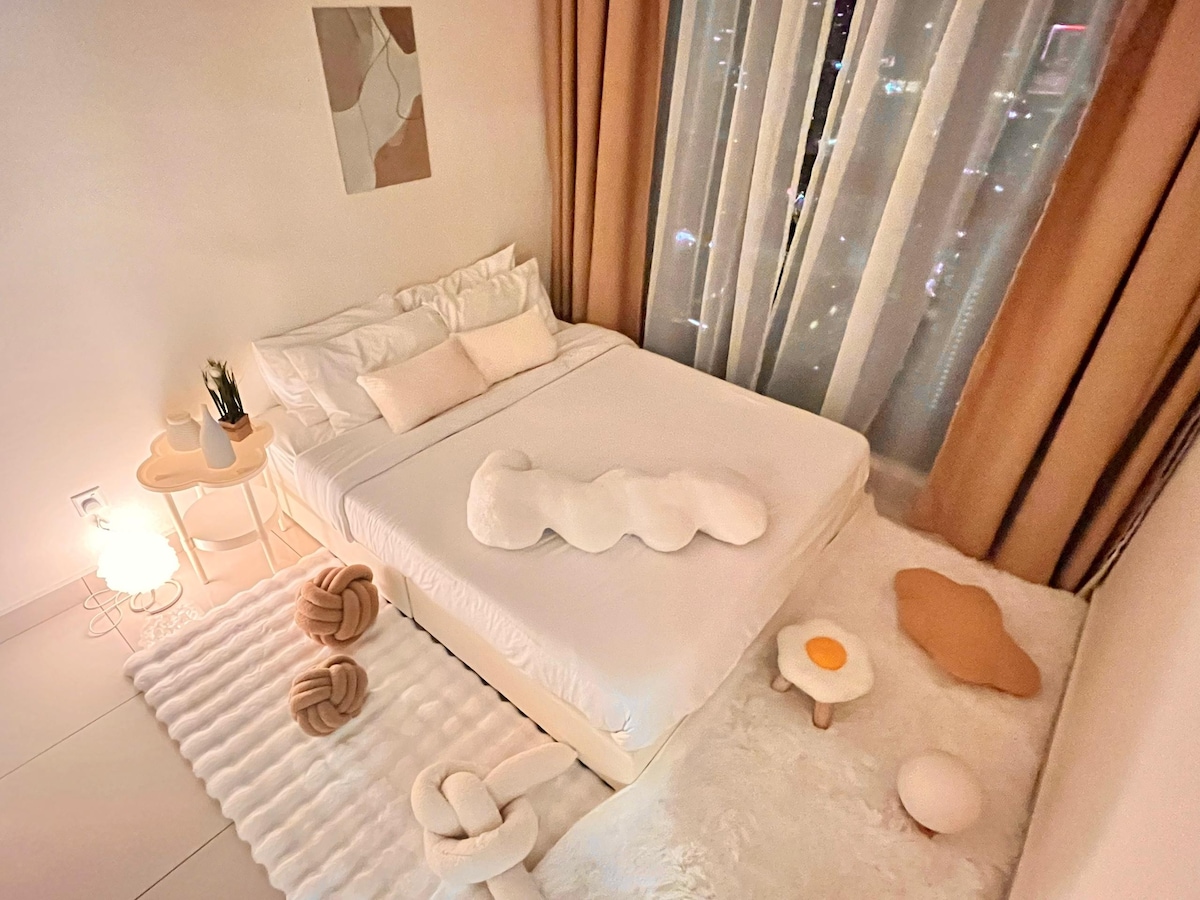 Sit back and relax in this calm, stylish space. Why Seashell suite at Lucentia Residence - Best views of KL - Beautifully decorated with a fun spirit - Centrally located & attached to public transit hub - Fast wifi - 2 TVs with Netflix & others - 2 gorgeous pools - Family friendly with baby crib & highchair - Gym, pool table, BBQ pits, piano - Garage parking - Recommended to Sleeps 6, max 8 person - LaLaPort Shopping Mall & the WOW entertainment street are attached - Grocery, drug store & Cinema
