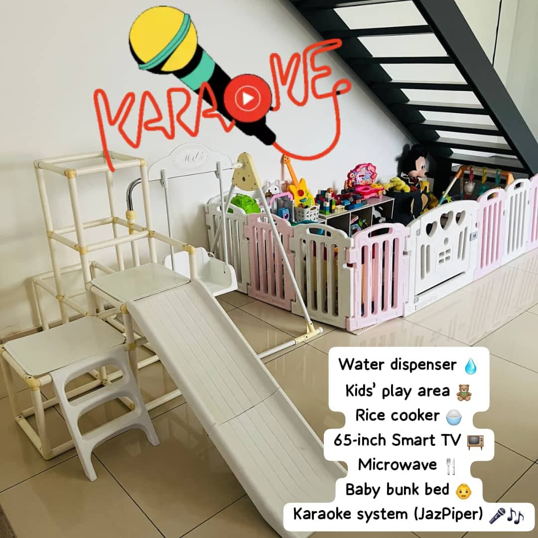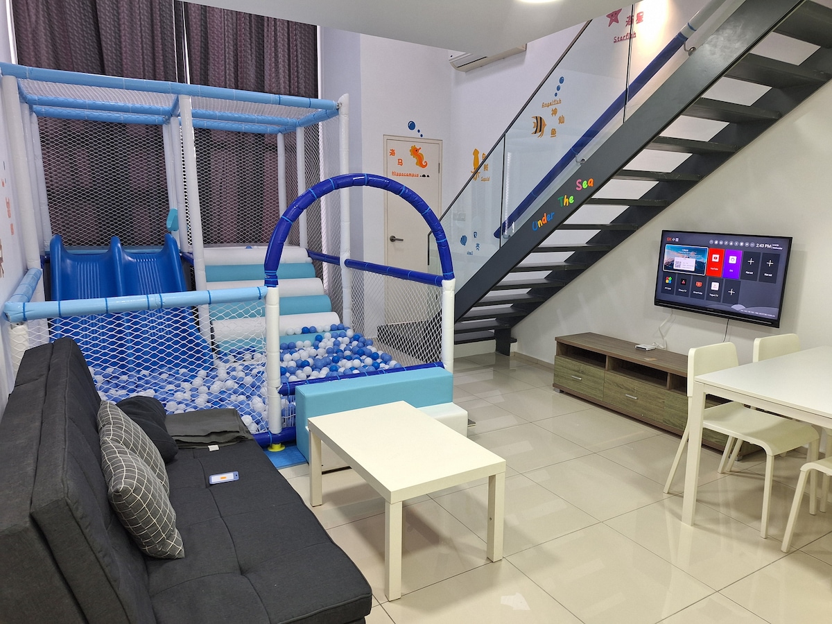 Welcome to ‘’ThankQ Daddy Mommy‘’, a cozy, stylish duplex designed for families with kids! Set in soft white tones with colorful accents, this home features a fun indoor slide, a cinema-style projector, and a fancy design that delights both children and adults. Perfect for kids aged 3+, it’s located above a mall with restaurants and shops, and directly connected to the MRT – just 3–4 stops to Pavilion & TRX!